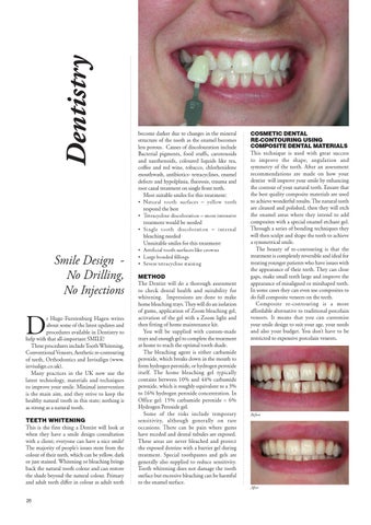 r Hugo Furstenburg Hagen writes about some of the latest updates and procedures available in Dentistry to help with that all-important SMILE! These procedures include Tooth Whitening, Conventional Veneers, Aesthetic re-contouring of teeth, Orthodontics and Invisalign (www. invisalign.co.uk). Many practices in the UK now use the latest technology, materials and techniques to improve your smile. Minimal intervention is the main aim, and they strive to keep the healthy natural tooth in this state; nothing is as strong as a natural tooth. Teeth Whitening This is the first thing a Dentist will look at when they have a smile design consultation with a client; everyone can have a nice smile! The majority of people’s issues stem from the colour of their teeth, which can be yellow, dark or just stained. Whitening or bleaching brings back the natural tooth colour and can restore the shade beyond the natural colour. Primary and adult teeth differ in colour as adult teeth 26