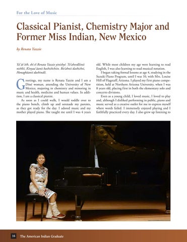 reetings, my name is Renata Yazzie and I am a Diné woman, attending the University of New Mexico, majoring in chemistry and minoring in music and health, medicine and human values. In addition, I am a classical pianist. As soon as I could walk, I would toddle over to the piano bench, climb up and serenade my parents, as they got ready for the day. I adored music and my mother played piano. She taught me until I was 4 years
