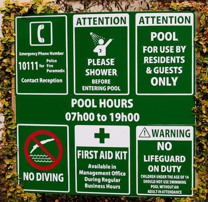 Designers must carefully review safety codes and integrate lifesaving equipment into the pool design. The equipment should be highly visible Commonly used items include an accessory pole, which is usually 12 feet (3.66 meters) long, and a throwing rope connected to a ring buoy. The rope should be about 1 5 times longer than the width of the pool, allowing it to be thrown to bathers in distress. In most cases, codes also require first aid kits, emergency phones, signs, and instructions for emergency shut-off switches Proper barriers should be designed to prevent unauthorized access to the pool, thus reducing the risk of drowning or injury. These barriers are vital when a pool lacks continuous supervision It's recommended that barriers do not block the view of the pool, with structures like handholds or horizontal members, which facilitate climbing, discouraged. The space between the pool deck or ground and the bottom of the barrier should be minimal to prevent a child from passing underneath.