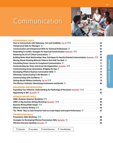 INTERPERSONAL SKILLS How to Communicate with Diplomacy, Tact and Credibility Top 10 C L . . . . . . . . . . . . . . . . . . . . . . . . . . . . . . . . . 62 Interpersonal Skills for Managers C . . . . . . . . . . . . . . . . . . . . . . . . . . . . . . . . . . . . . . . . . . . . . . . . . . . . . . . . . . . . . . . . . 64 Communication and Interpersonal Skills for Technical Professionals C . . . . . . . . . . . . . . . . . . . . . . . . . . . . . . . . . . 65 Responding to Conflict: Strategies for Improved Communication Bestseller C L . . . . . . . . . . . . . . . . . . . . . . . . . . 66 Mastering the Art of Critical Conversations C . . . . . . . . . . . . . . . . . . . . . . . . . . . . . . . . . . . . . . . . . . . . . . . . . . . . . . . . 67 Building Better Work Relationships: New Techniques for Results-Oriented Communication Bestseller C L . . 68 Moving Ahead: Breaking Behavior Patterns that Hold You Back C . . . . . . . . . . . . . . . . . . . . . . . . . . . . . . . . . . . . . 70 Storytelling Power: Secrets for Exceptional Communication C . . . . . . . . . . . . . . . . . . . . . . . . . . . . . . . . . . . . . . . . . 71 Communicating Up, Down and Across the Organization Bestseller C L . . . . . . . . . . . . . . . . . . . . . . . . . . . . . . . . . . 73 Communicating Across Generations: Bridging the Gap C . . . . . . . . . . . . . . . . . . . . . . . . . . . . . . . . . . . . . . . . . . . . . . 74 Developing Effective Business Conversation Skills C . . . . . . . . . . . . . . . . . . . . . . . . . . . . . . . . . . . . . . . . . . . . . . . . . . 75 Effectively Communicating in the Moment C . . . . . . . . . . . . . . . . . . . . . . . . . . . . . . . . . . . . . . . . . . . . . . . . . . . . . . . . 76 Communicating with Confidence C . . . . . . . . . . . . . . . . . . . . . . . . . . . . . . . . . . . . . . . . . . . . . . . . . . . . . . . . . . . . . . . . . 77 Getting Results Without Authority Top 10 C L . . . . . . . . . . . . . . . . . . . . . . . . . . . . . . . . . . . . . . . . . . . . . . . . . . . . . . . 78 The Effective Facilitator: Maximizing Involvement and Results C . . . . . . . . . . . . . . . . . . . . . . . . . . . . . . . . . . . . . . . 80 INFLUENCING AND NEGOTIATING Expanding Your Influence: Understanding the Psychology of Persuasion Bestseller C L . . . . . . . . . . . . . . . . . . .81 Negotiating to Win Bestseller C . . . . . . . . . . . . . . . . . . . . . . . . . . . . . . . . . . . . . . . . . . . . . . . . . . . . . . . . . . . . . . . . . . . 82 BUSINESS WRITING SKILLS AMA’s Business Grammar Workshop C L . . . . . . . . . . . . . . . . . . . . . . . . . . . . . . . . . . . . . . . . . . . . . . . . . . . . . . . . . . . . 83 AMA’s 2-Day Business Writing Workshop Bestseller C L . . . . . . . . . . . . . . . . . . . . . . . . . . . . . . . . . . . . . . . . . . . . . . 84 Business Writing Made Simple C 1 . . . . . . . . . . . . . . . . . . . . . . . . . . . . . . . . . . . . . . . . . . . . . . . . . . . . . . . . . . . . . . . . . 85 Effective Technical Writing C L . . . . . . . . . . . . . . . . . . . . . . . . . . . . . . . . . . . . . . . . . . . . . . . . . . . . . . . . . . . . . . . . . . . . . 86 The “Write” Way to Lead: Powerful Tools to Create Impact and Inspire Performance C . . . . . . . . . . . . . . . . . . . 87 PRESENTATION SKILLS Presentation Skills Workshop