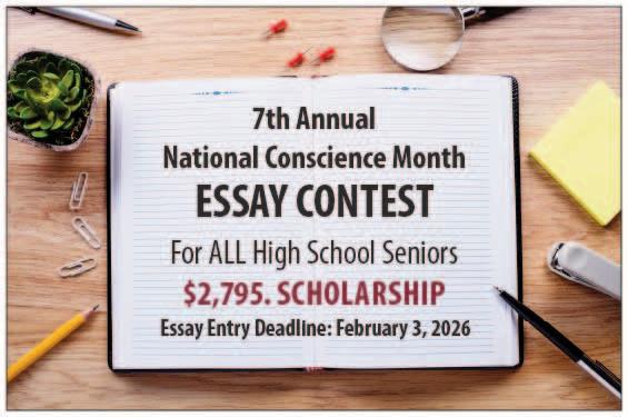 Submission Instructions: No membership or purchase of any kind is required to take part in the National Conscience Month Essay Contest. Essay submissions should be sent by email to ami@americanmeditation.org. Submissions should be sent as a PDF attachment. Submissions must be received no later than Tuesday, February 3, 2026. The contest winner will be notified by email. Submissions may be featured by the American Meditation Institute either online or in print in connection with National Conscience Month programming and promotions, and the right to reproduce submissions is reserved by AMI. For complete information visit: ConscienceMonth.org E-mail essays to: ami@americanmeditation.org Essays must include: your name, address, phone number and high school name.