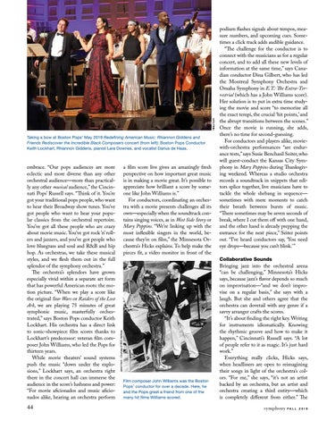 podium flashes signals about tempos, measure numbers, and upcoming cues. Sometimes a click track adds audible guidance. “The challenge for the conductor is to connect with the musicians as for a regular concert, and to add all these new levels of information at the same time,” says Canadian conductor Dina Gilbert, who has led the Montreal Symphony Orchestra and Omaha Symphony in E.T.: The Extra-Terrestrial (which has a John Williams score). Her solution is to put in extra time studying the movie and score “to memorize all the exact tempi, the crucial ‘hit points,’ and the abrupt transitions between the scenes.” Once the movie is running, she adds, there’s no time for second-guessing. For conductors and players alike, moviewith-orchestra performances “are endurance tests,” says Susie Benchasil Seiter, who will guest-conduct the Kansas City Symphony in Mary Poppins during Thanksgiving weekend. Whereas a studio orchestra records a soundtrack in snippets that editors splice together, live musicians have to tackle the whole shebang in sequence— sometimes with mere moments to catch their breath between bursts of music. “There sometimes may be seven seconds of break, where I cut them off with one hand, and the other hand is already prepping the entrance for the next piece,” Seiter points out. “I’ve heard conductors say, ‘You need eye drops—because you can’t blink.’ ” Collaborative Sounds