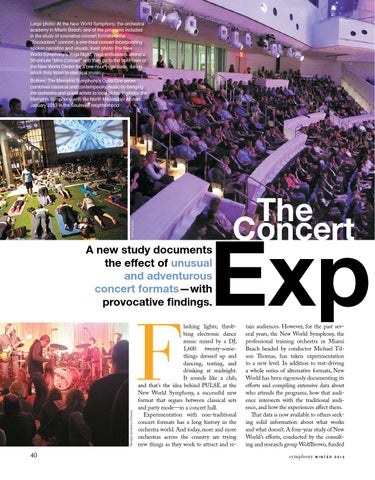 tain audiences. However, for the past several years, the New World Symphony, the professional training orchestra in Miami Beach headed by conductor Michael Tilson Thomas, has taken experimentation to a new level. In addition to test-driving a whole series of alternative formats, New World has been rigorously documenting its efforts and compiling extensive data about who attends the programs, how that audience intersects with the traditional audience, and how the experiences affect them. That data is now available to others seeking solid information about what works and what doesn’t. A four-year study of New World’s efforts, conducted by the consulting and research group WolfBrown, funded symphony