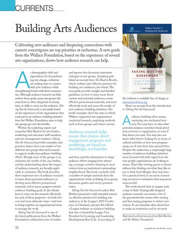 s demographics shift and expectations for the performing arts change, orchestras are seeking ways to connect with new audiences while strengthening bonds with their communities. Although audience research can help achieve those goals, many arts groups shy away from it, often citing lack of money, time, or skills to carry out the endeavor. Taking Out the Guesswork, a new guide based on the experiences of arts organizations that took part in an audience-building initiative from the Wallace Foundation, aims to help arts groups get over the hurdles. Written by marketing expert and researcher Bob Harlow for arts leaders, marketing and education staff members, and arts-management students, Taking Out the Guesswork provides examples and practices drawn from case studies of ten different arts groups that used research to support multi-year audience-building efforts. Though none of the groups is an orchestra, the results of the case studies, and the understanding about the impact of audience research, are broadly applicable to orchestras. The book describes three important uses of audience research: to learn about potential audiences; to develop more effective promotional materials; and to assess progress toward audience-building goals. It also details how to carry out the research effectively for each of those purposes—in both lowcost and more elaborate ways—and how to bring together an organizational team to manage the work. Taking Out the Guesswork is one of the latest publications from the Wallace Foundation’s influential series of studies