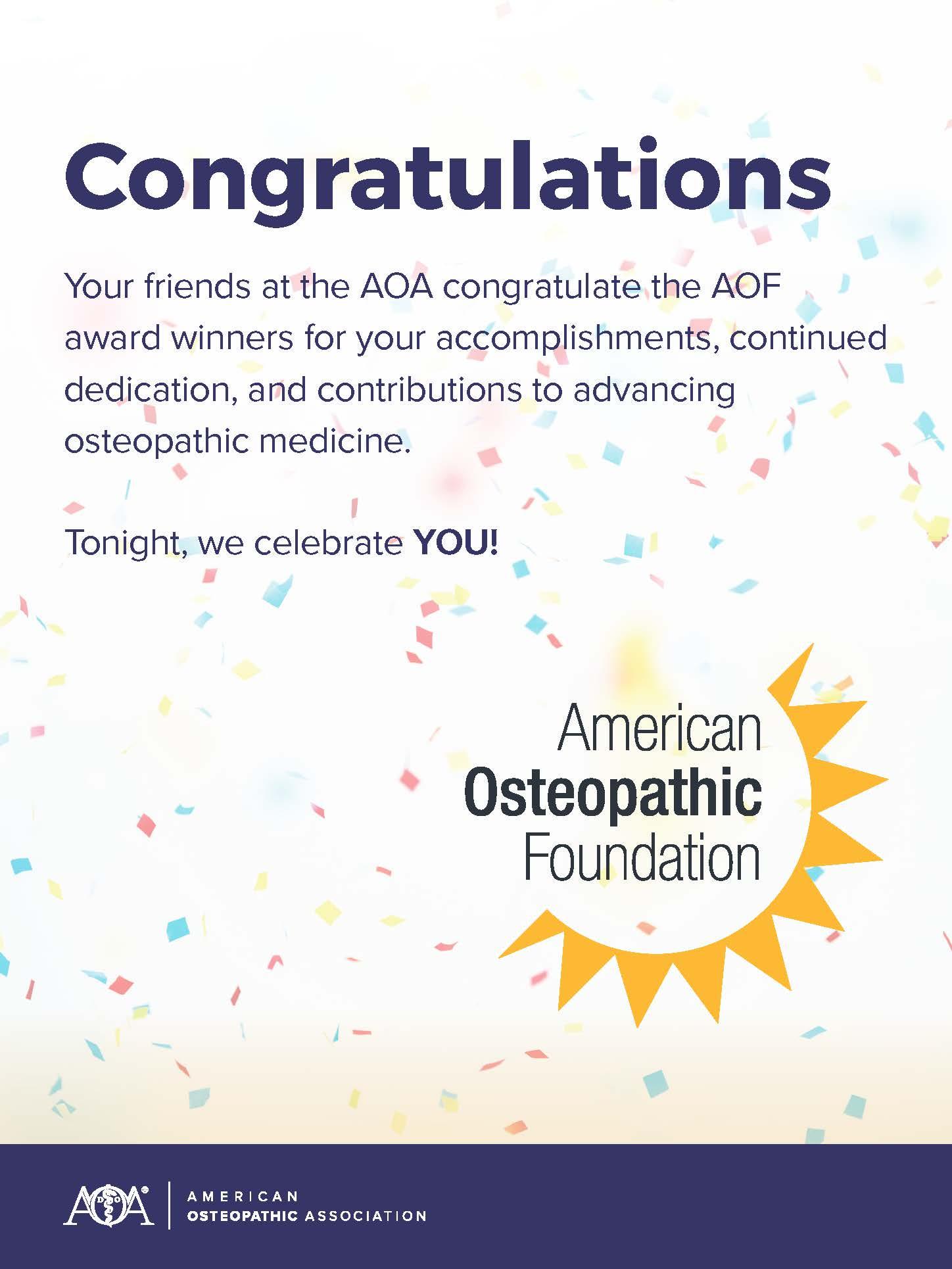 This evening is a testament to the vision and committment of the many individuals who have contributed to the growth and success of the AOF since its inception in 1949. We stand on the shoulders of pioneers who believed in the power of Osteopathic medicine to transform lives, and who worked tirelessly to ensure that future generations of DOs would have the resources and support necessary to thrive in their careers. Their collective legacy is alive and well, as evidenced by the vibrant and dynamic community we celebrate tonight.