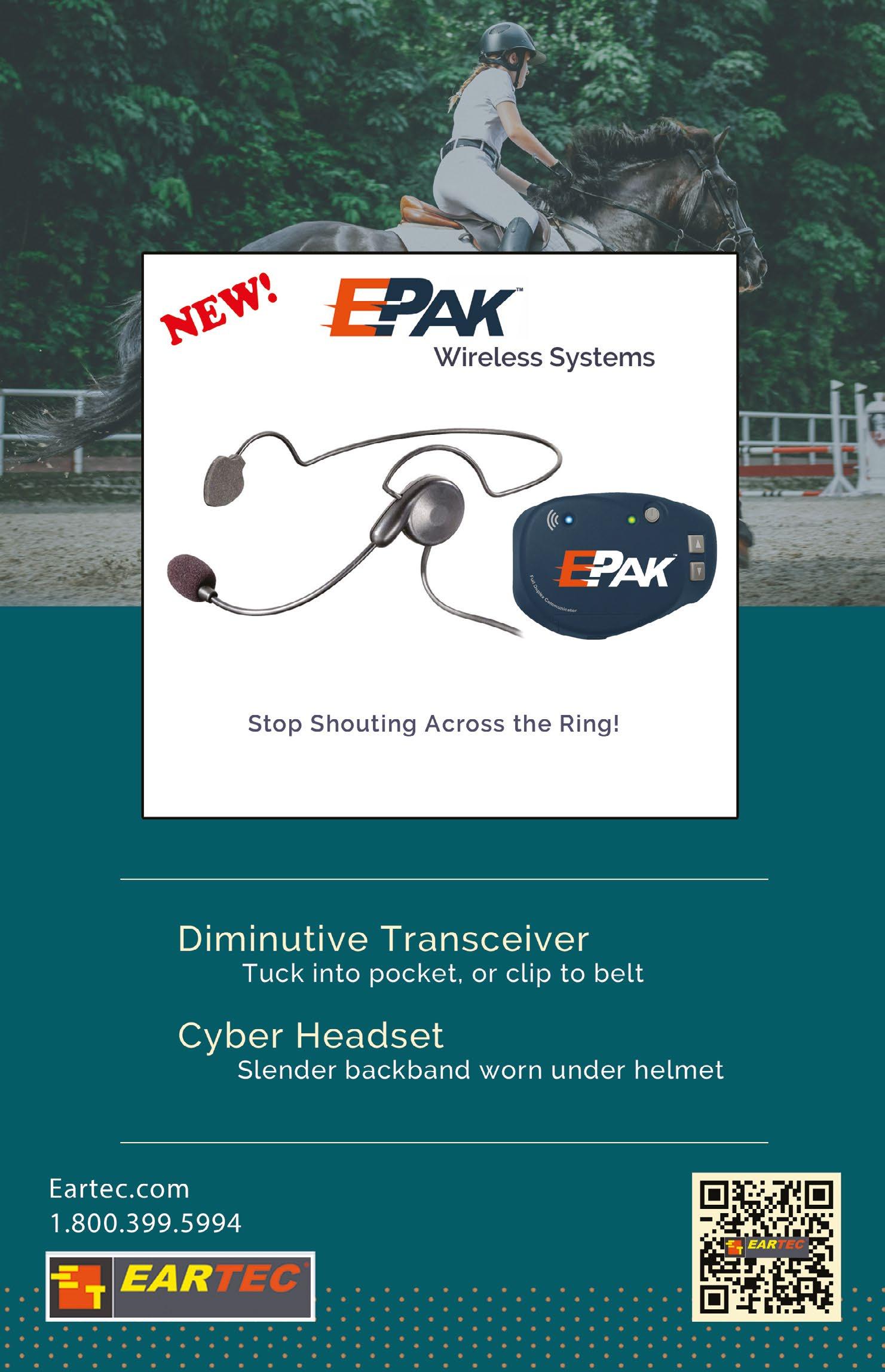 The all new EPAK Cyber by Eartec is a breakthrough alternative to traditional communication systems. Boasting full-duplex wireless communication without the need for a base station, this lightweight accessory features a slimline back band that can be worn comfortably under a riding helmet. Up to 9 users can communicate hands free at whisper levels offering a dynamic experience for both the coach and student riders.
