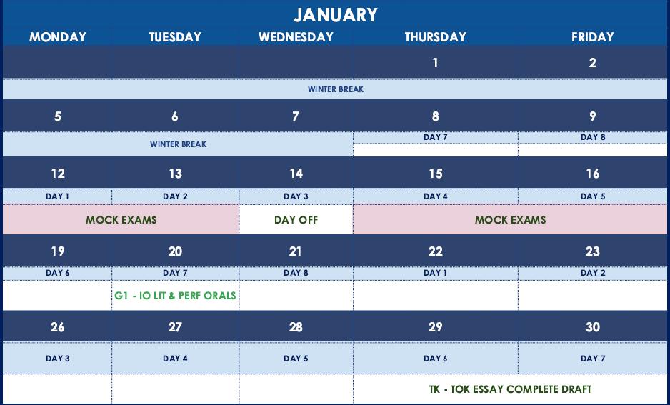 The IB written Exams occur in May of the second year of the programme. In preparation for these, students sit "Mock Exams" (see dates on the deadline calendar). These Mock Exams are designed to replicate IB exam conditions as closely as possible. Their purpose is to help the student become familiar with the exam process, develop effective exam-taking strategies, and understand what to expect during the real exams.