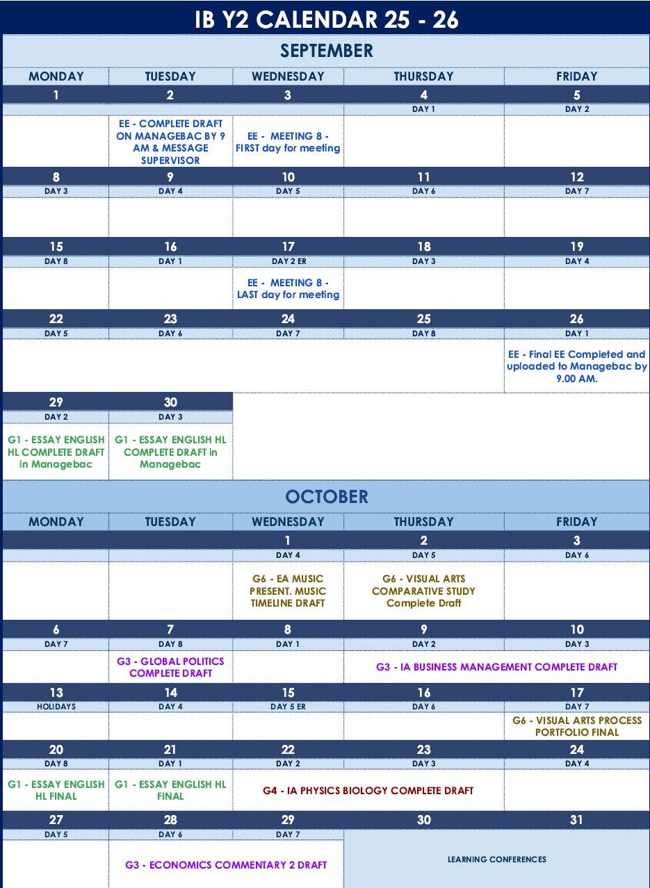 - IB Deadlines Y1 and Y2 where the student can find the deadlines in a google calendar, and also in PDF format