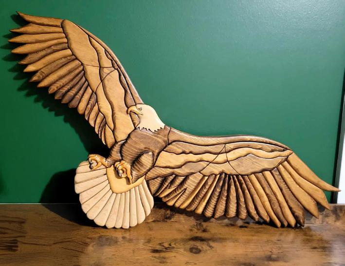 Mosaic 3D wood inlay wall hanging. Handcrafted with various woods to obtain the perfect color mix. Mahogany, rosewood, white birch, aspen, oak, maple, walnut and red cedar. 34” x 17”
