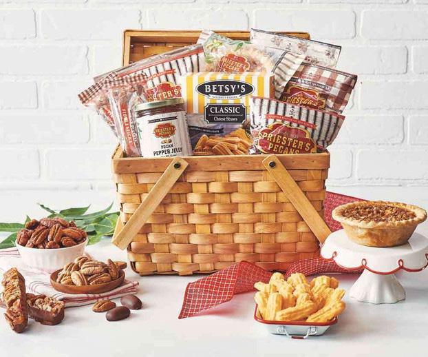 Priester’s Pecans is a family-owned company specializing in delicious old-fashioned, farm fresh gifts like pecan desserts, pecan candies, pecan pies, cakes, and bulk pecans. As pecan suppliers and candy makers for over 7 decades, their Gourmet Pecan Pies, Gift Tins, Baskets, and Candies have delighted countless families. Priester’s are long time supporters of youth livestock programs and fellow cattlemen. Basket includes over 4 pounds of favorites!
