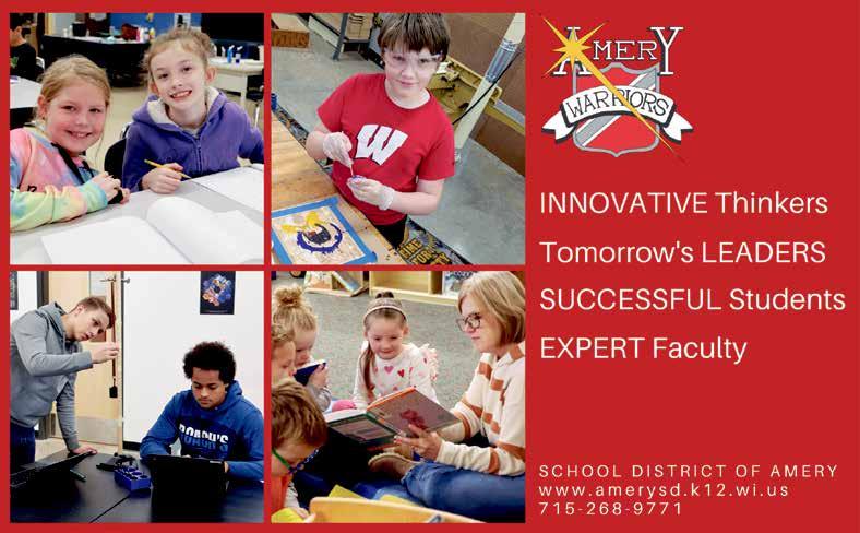 We hope residents and visitors alike enjoy the 2025 Explore Amery Guide produced by the Amery Free Press. We hope this product is useful and informative for people living in this area or who are considering moving here. There are so many things to do and enjoy whether living here or just visiting. Please feel free to let us know how we can improve this product in the future by emailing us at editor@theameryfreepress.com. Enjoy your time here. Tom, Diane, Justin, Laura, Donna, and Nicole