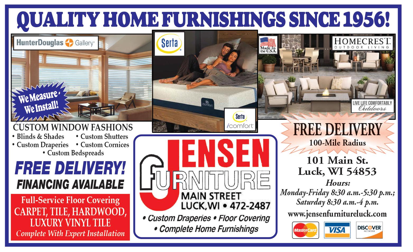 JUNE 9 – JUNE 23, 2023 | THE LAKER 11C (651) 488-8605 PUT YOUR LAST ROOF ON FIRST Roof Replacements Installations Repairs Stop LEAKS Call Today 715-352-7528 LIC # MN & WI BALSAM LAKE 100 Mill Street Balsam Lake, WI 54810 715.405.3366 Baldwin • Clear Lake • Chippewa Falls • Plum City • Spring Valley Make ‘23 a year to remember. Member FDIC www.Pillar.Bank Strengthening communities for over 140 years. BLINDS • SHUTTERS • DRAPES BLINDS • • 715-386-6093 403C Vine St, Hudson • Open by appointment 575 N. Knowles Ave, New Richmond Tue.-Fri. 9:00-4:00 valleyviewwindowtreatments.com becky@valleyviewwindowtreatments.com in association with Stone Creek Custom Interiors 551 State Hwy 46 • Amery, WI 54001 CALL US TODAY FOR AN IN-HOME CONSULTATION! We Install, We Measure, We Design