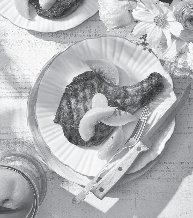 4. Set up grill for direct cooking and heat to medium-high. Once hot, clean and lightly oil grates. Grill, turning occasionally, until the internal temperature on an instant-read thermometer reads 145°F, 8 to 10 minutes. Let rest 5 minutes. Serve with sliced pickled peaches. ■