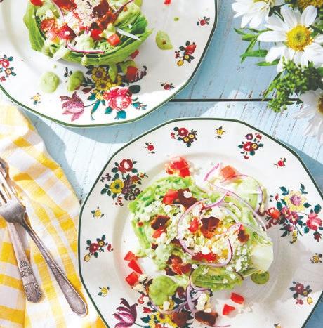 2. Make salad: Top lettuce wedges with dressing, onion, cheese, bacon, and tomatoes, dividing evenly. Season with salt and pepper. ■