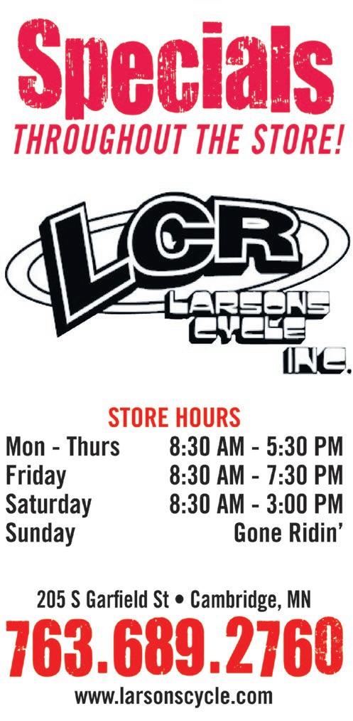 Trucking Services 61 ISANTI & CHISAGO COUNTIES SOURCE 2024 Exceptional Service is Mid Minnesota Trucking’s promise to you! One of our greatest strengths is our small• Liftgate pickup and delivery service • Inside pickup and delivery service • Exclusive service anywhere in Minnesota • Interline with other carriers • Most shipments delivered direct www.midminnesotatrucking.com Fri. 9am-7:00pm • Sat. 9am-3:00pm Sun. Gone Ridin’ 205 S. Garfield St. Cambridge, MN www.larsonscycle.com Professional riders depicted on a closed course. Dress properly for your ride with a helmet, eye protection, long sleeves, long pants, gloves and boots. Yamaha and the Motorcycle Safety Foundation encourage you to ride safely and respect the environment. For further information regarding the MSF course, please call 1-800-446-9227. Do not drink and ride. It is illegal and dangerous. ©2023 Yamaha Motor Corporation, U.S.A. All rights reserved. � This is approved for size 7.193” x 4.6”. The only change is they open at 9:00 am.