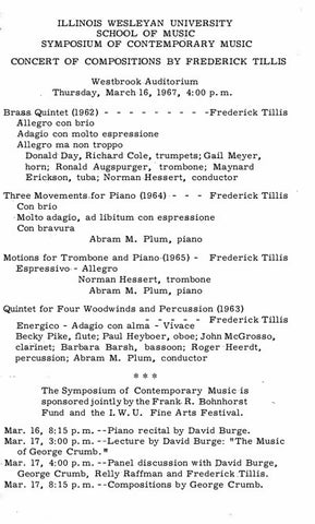 ILLINOIS WESLEYAN UNIVERSITY SCHOOL OF MUSIC SYMPOSIUM OF CONTEMPORARY MUSIC CONCERT OF COMPOSITIONS BY FREDERICK TILLIS Westbrook Auditorium Thursday, March 16, 1967, 4: 00 p. m. Brass" Quintet (1962) - - - - - - - - -Frederick Tillis Allegro con brio Adagio con molto espressione Allegro ma non troppo Donald Day, Richard Cole, trumpets; Gail Meyer, horn; Ronald Augspurger, "trombone; Maynard Erickson, tuba; Norman Bessert, conductor Three Movements for Piano (1964) . - - - Frederick Tillis Con brio . Molto adagio, ad libitum con espressione Con bravura Abram M. Plum, piano Motions for Trombone and Piano¡(1965) - Frederick Tillis Espressivo - Allegro Norman Hessert, trombone Abram M. Plum, piano Quintet for Four Woodwinds and Percussion (1963) - - - - - Frederick Tillis Energico - Adagio con alma - Vivace Becky Pike, flute; Paul Heyboer, oboe; John McGrosso, clar"inet; Barbara Barsh, bassoon; Roger' Heerdt, percussion; Abram M. Plum, conductor