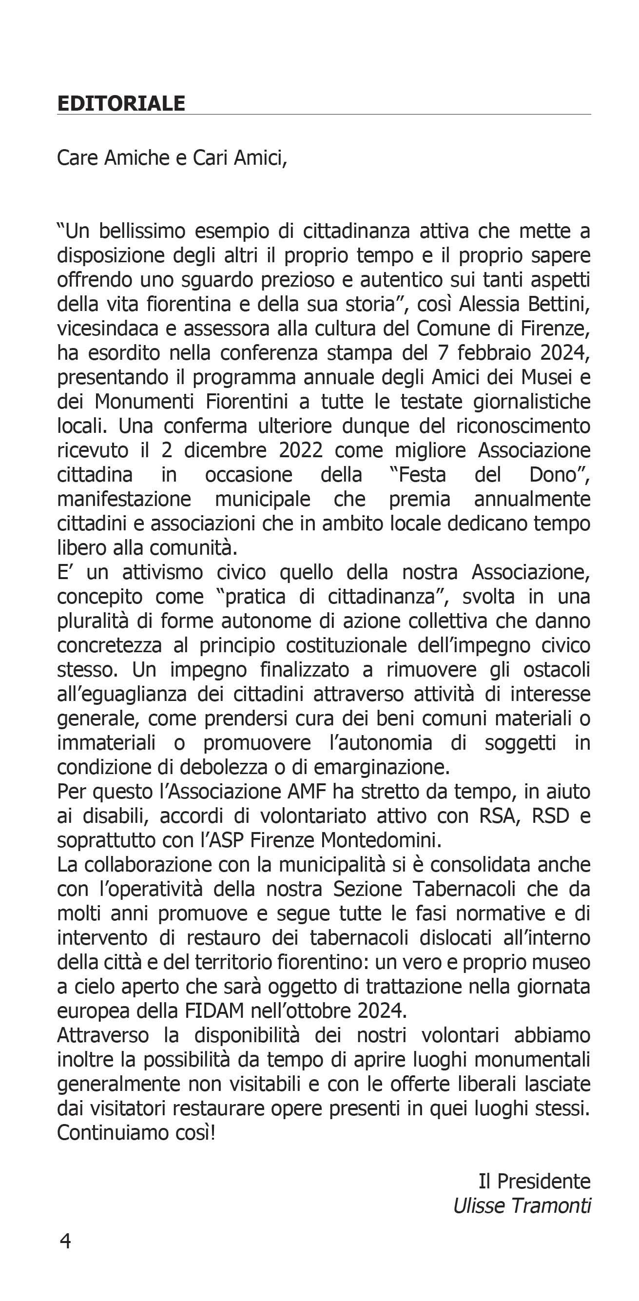 L’Associazione, senza scopo di lucro, ha come missione statutaria quella di affiancare ed aiutare le iniziative dei Musei di Firenze e di tutta l’Area Metropolitana, sia statali che degli Enti locali o di Fondazioni pubbliche e private, prestando la propria opera con soci volontari in maniera totalmente gratuita.