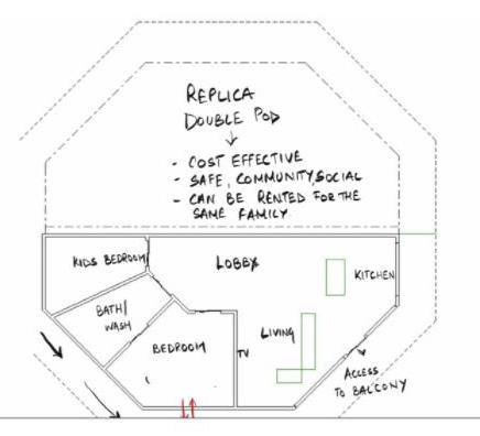 The idea of having a hexagon layout was to encourage stability and sustainability. The inspiration is from the honeycomb as it promotes a close to nature and environment layout. It encourages the ability to incorporate two living pods/units for the docking of the vehicle.