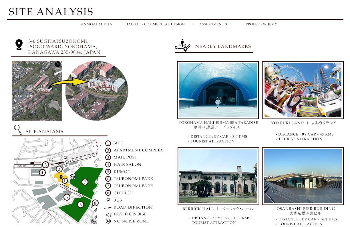 CLIENT Senior Living Center ADDRESS 3-6 Sugitatsubonomi, Isogo Ward,Yokohama, Kansagawa 235-0034, Japan S I T E A N A L Y S I S 3-6 Sugitatsubonomi, Isogo Ward,Yokohama, Kanagawa 235-0034, SITE ANALYSIS SITE APARTMENT COMPLEX MAIL POST KUMON TSUBONOMI PARK TSUBONOMI PARK CHURCH BUS ROAD DIRECTION HAIR SALON TRAFFIC NOISE NO NOISE ZONE