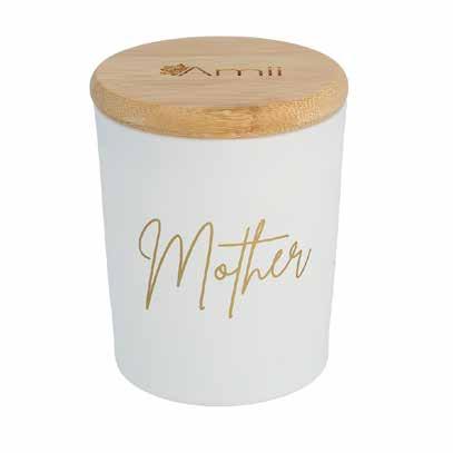 The bamboo lid adds warmth to the white matte glass. The message is attached to the candle as a golden laser cut sticker. All white message candles are passion scented.
