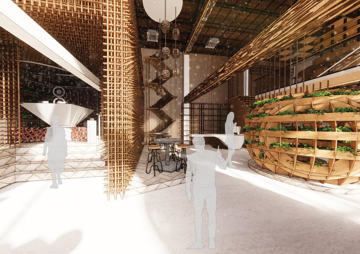Lakudi is a creator hub promoting wood carving and craftsmanship among younger generations. It offers spaces for learning and resting, with biophilic design enhancing indoor well-being and generating extra income through selling or using plants in the crafting workshop.