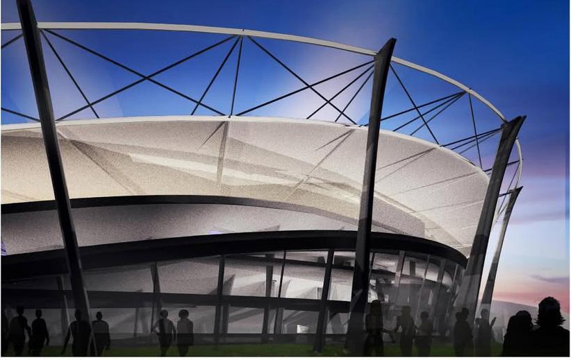 BEGIN WITH A PURE HYPERBOLIC PARABOLOID THAT HOVERS OVER THE STADIUM PROVIDING A PROTECTING COVER.