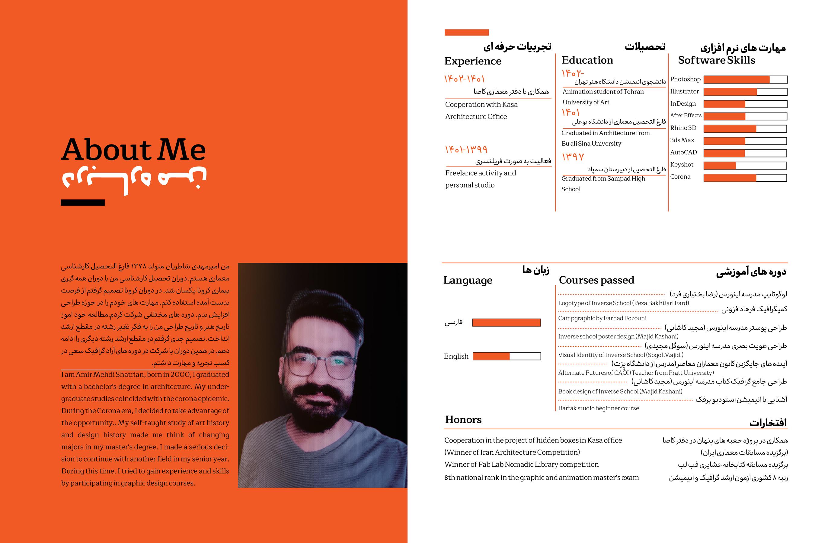 Contact Email: A Amirmahdyshaterian@gmail.com 09186764695 Phone Number: A یطابترا یاه هار هموزر CV P1-Pastry cafe hoora P2-Nomadic Libray P3-Deliso P6-Arcitecture Clipart P7-Visual Album Design P8-Poster Design P9-Arcitecture Projects P10-3D Model Projects P4-Full Moon Coffe P5-Alternate Future 3 4 7 10 13 16 19 22 24 27 29 اروه یدانق هفاک-1پ یریاشع هناخباتک-2پ وسیلد-3پ یفاک نوم لوف-4پ نیزگیاج هدنیآ-5پ یرامعم یرگریوصت-6پ یرادید موبلآ-7پ رتسوپ یحارط-8پ یرامعم یاه هژورپ-9پ یدعب هس یاه هژورپ-10پ تسرهف Contents https://www.linkedin.com/ in/amirmahdy-shateri/an-67003b230 @Am_Shaterian linkedin: A Instagram: A