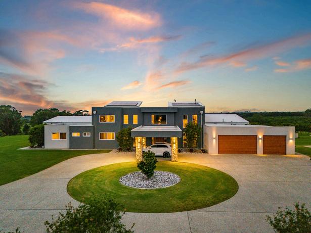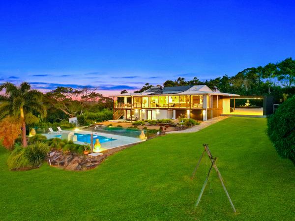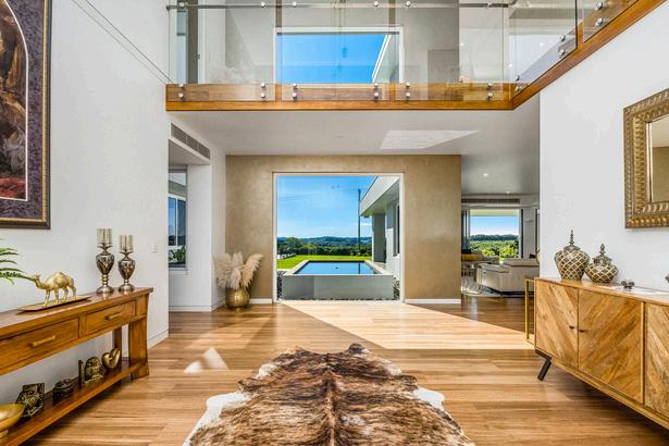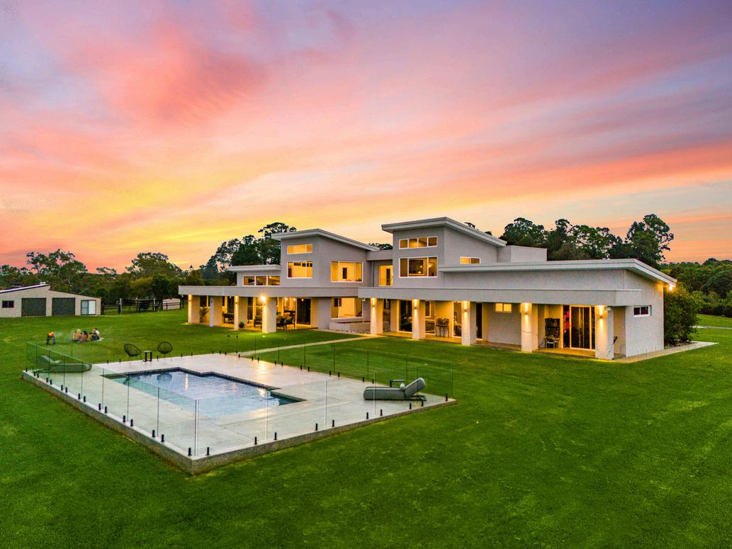 A spectacular modern North Coast hinterland quality master-built home set on 10 park-like acres that is entered via a solar-powered gate, with spectacular hinterland views that can be enjoyed through a multitude of glass windows and doors throughout. The home is entered through an impressive oversized Rosewood front door, where you're immediately met with an expansive view of the usable land and down the valley. Moving into the open plan living area, consisting of a lounge, dining, powder room and kitchen area with