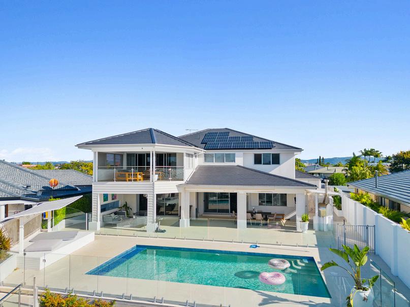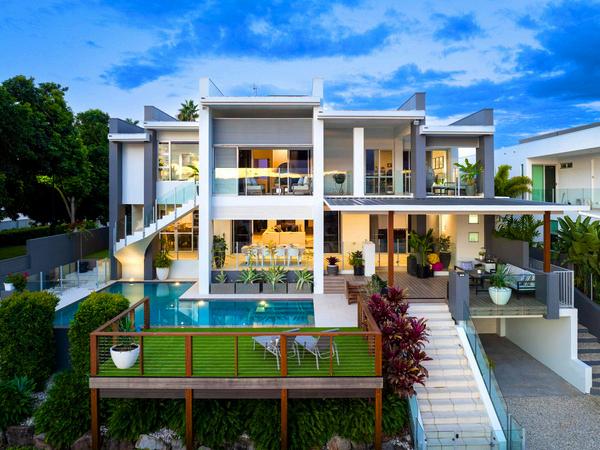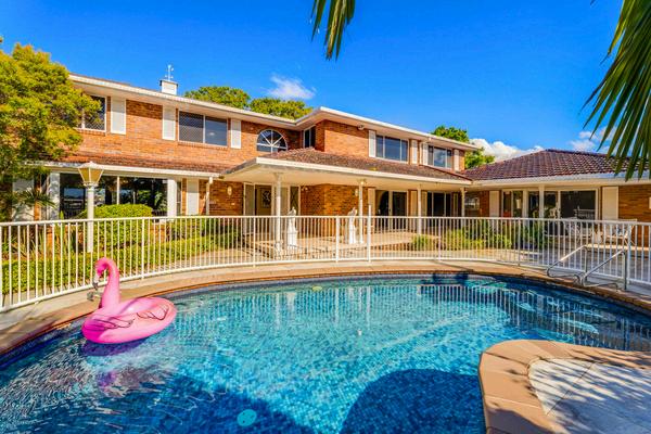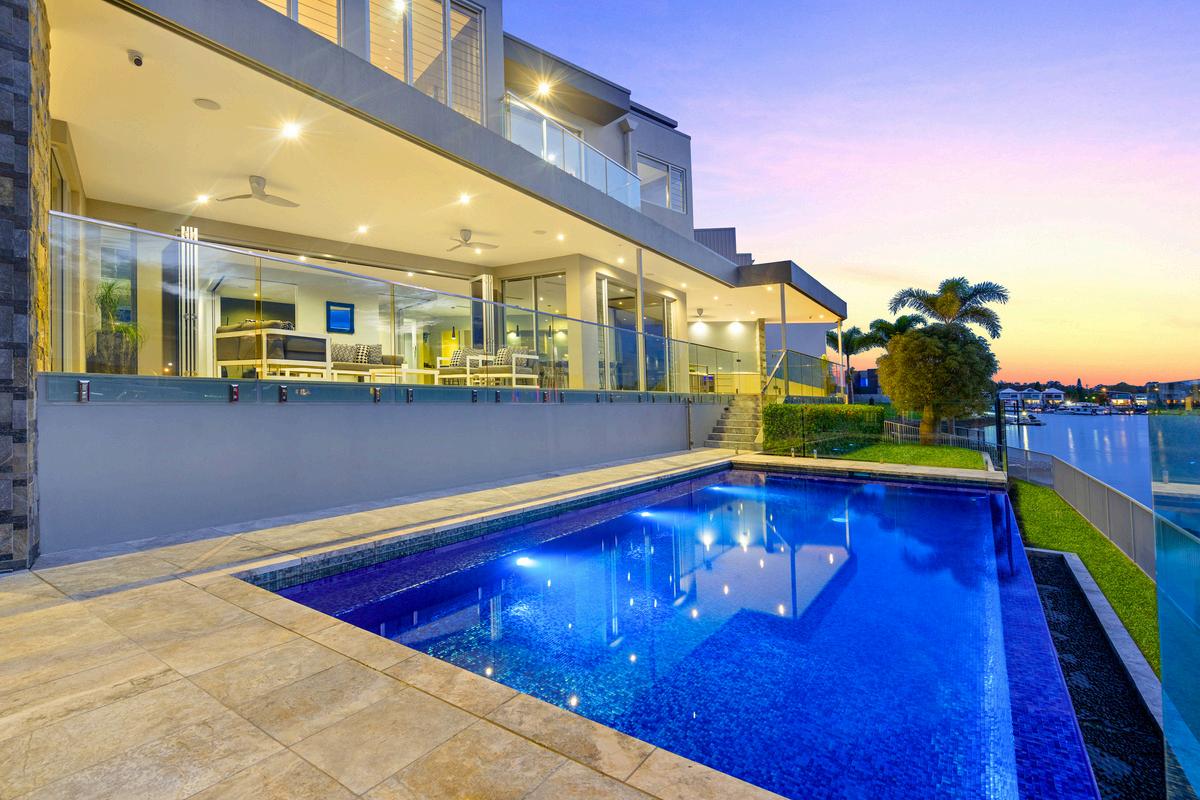 A sophisticated and luxury tri-level family home positioned on the Main River in a commanding central Gold Coast location. This sprawling 3 level luxury residence of over 1,100sqm* under roof, boasts multiple entertaining areas accented by flawless opulent accent finishes throughout. The home enjoys 5 ensuited bedrooms, full glass front garden office, multiple family breakout formal and informal areas including, a full media rumpus room with wet bar, 3 enviable riverfront alfresco entertaining areas, a supersized integrated tiled inground pool and a secure basement for 8 cars plus bikes, storage and gym.