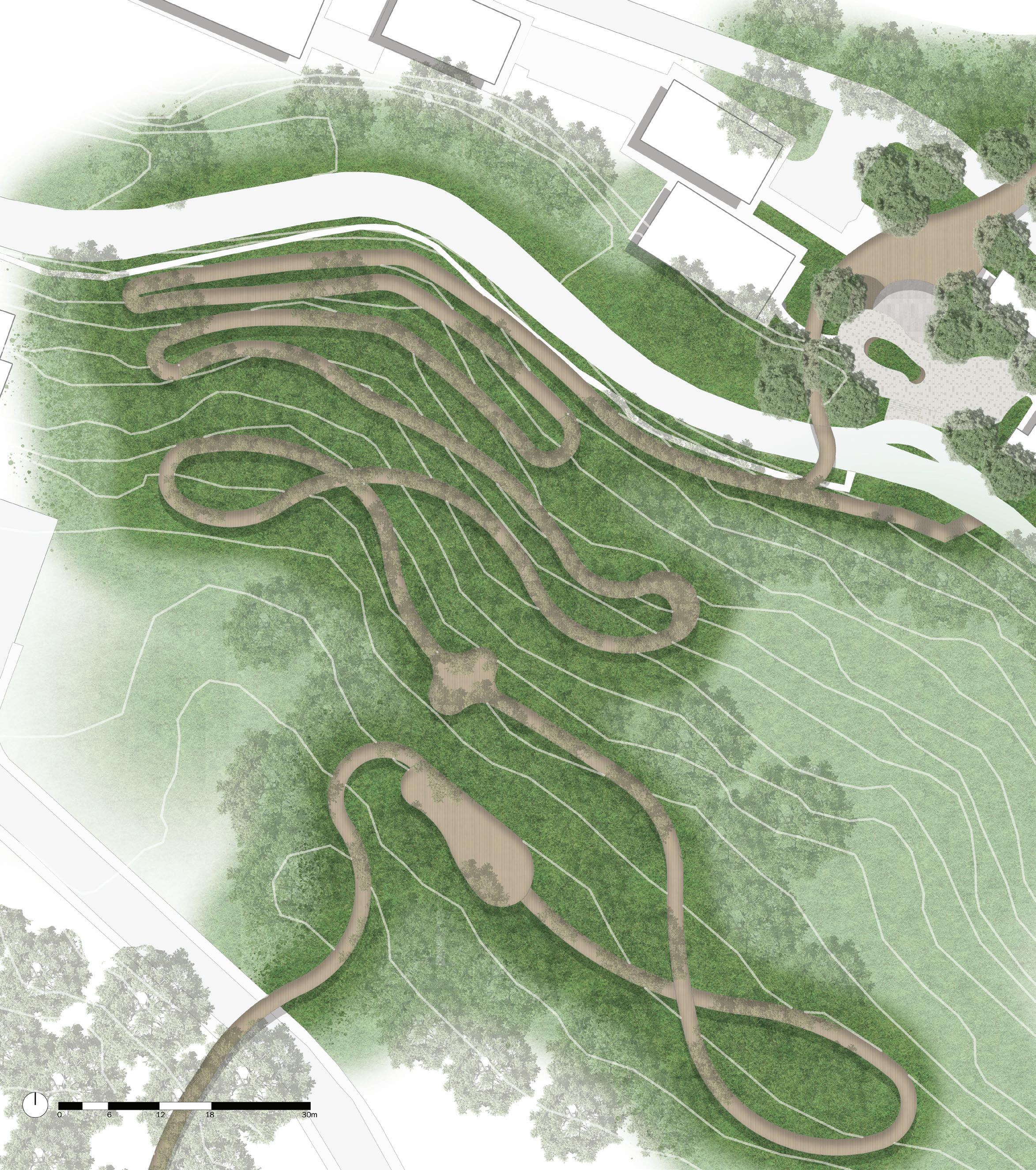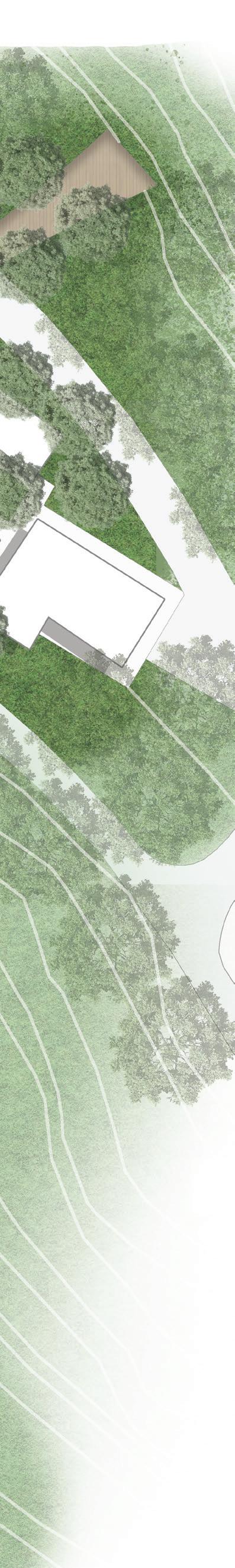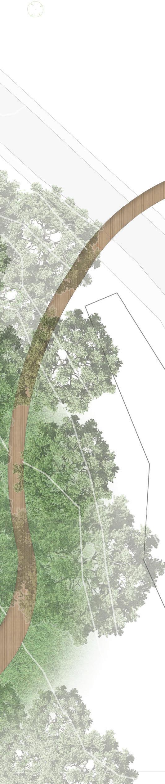 Strategically positioned within the contoured landscape, the Nature Nodes offer unique vantage points where the topography cradles the space. Placed thoughtfully in the wooded area, these nodes allow users to safely immerse themselves in the beauty of the forest floor. Providing a close and secure connection to nature, these nodes invite visitors to appreciate the intricate details of the natural surroundings in a serene and harmonious setting.