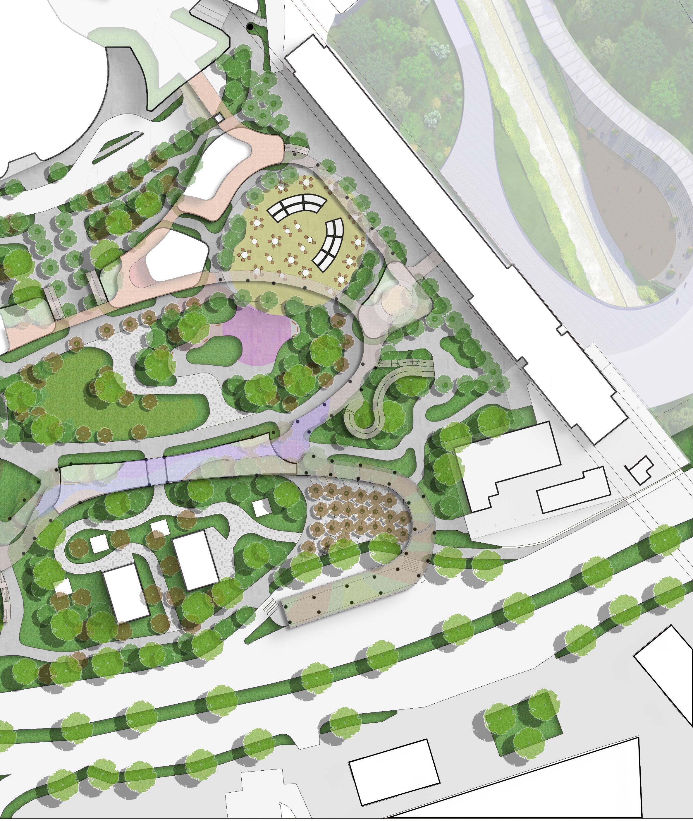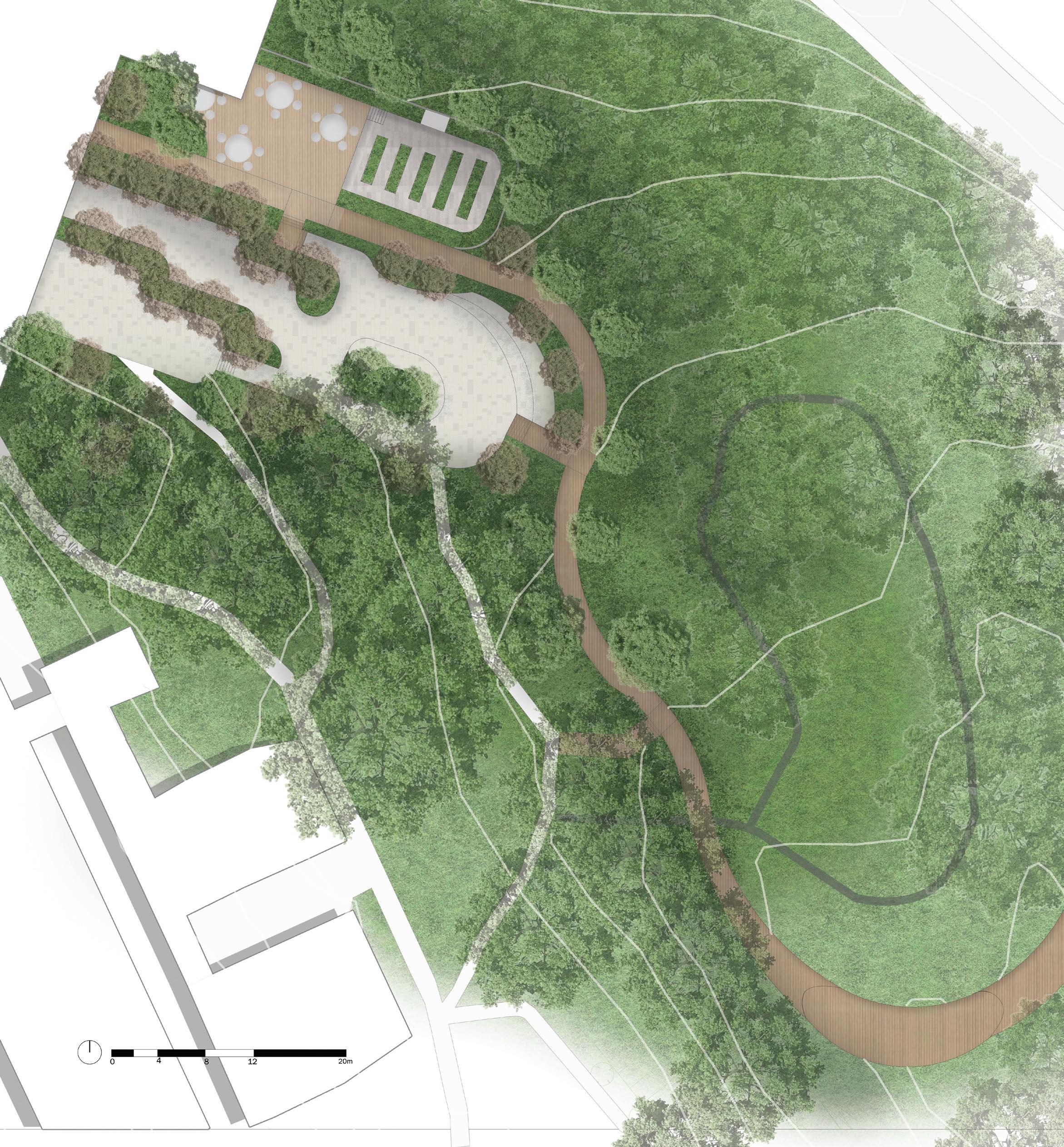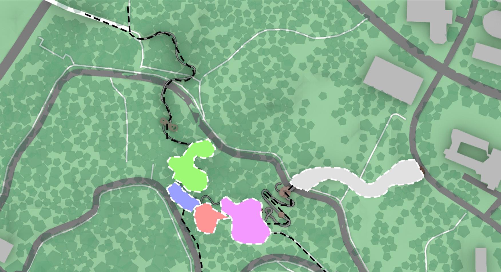 Strategically positioned within the contoured landscape, the Nature Nodes offer unique vantage points where the topography cradles the space. Placed thoughtfully in the wooded area, these nodes allow users to safely immerse themselves in the beauty of the forest floor. Providing a close and secure connection to nature, these nodes invite visitors to appreciate the intricate details of the natural surroundings in a serene and harmonious setting.