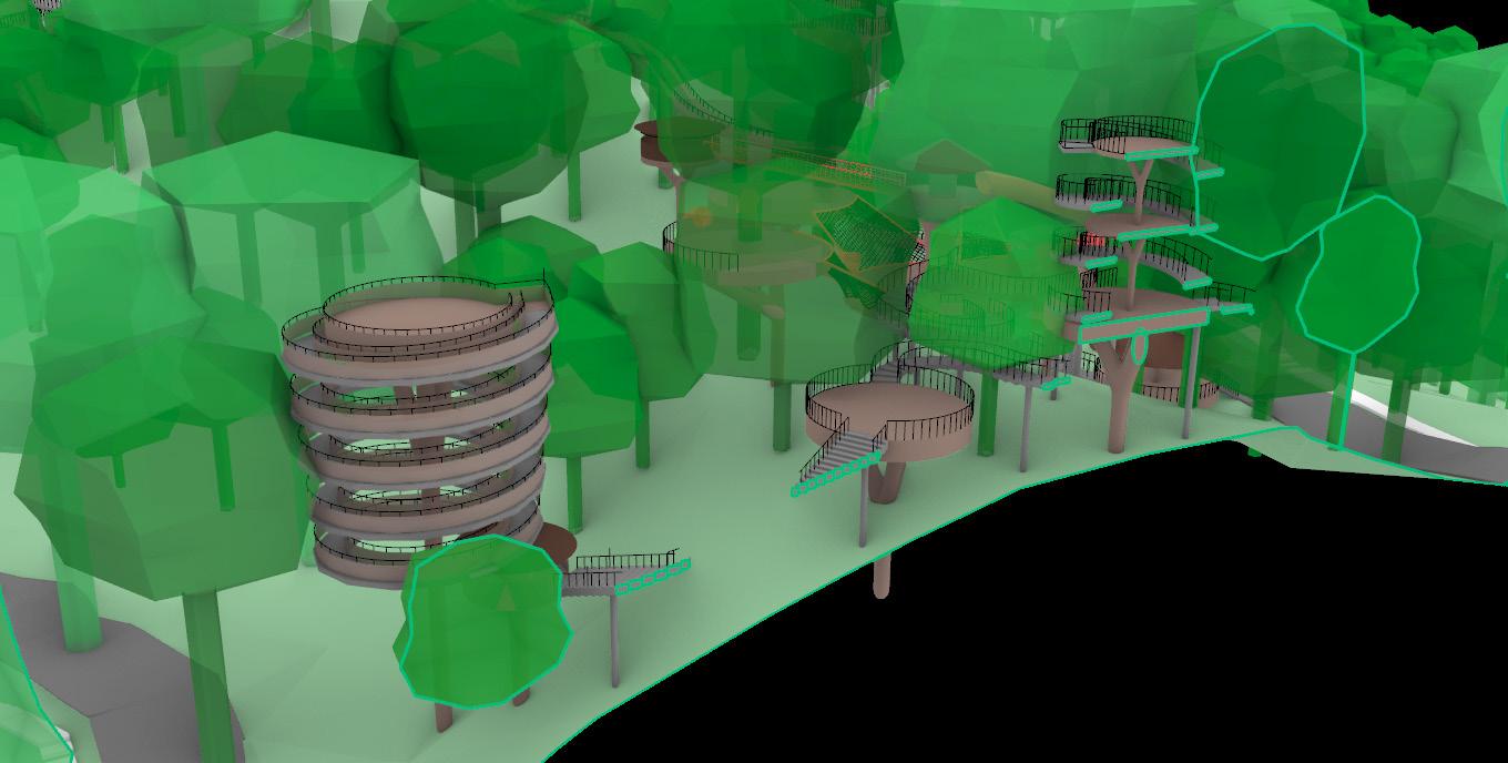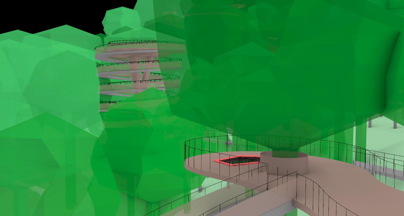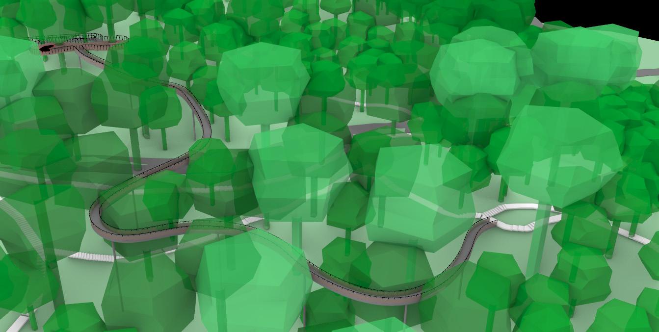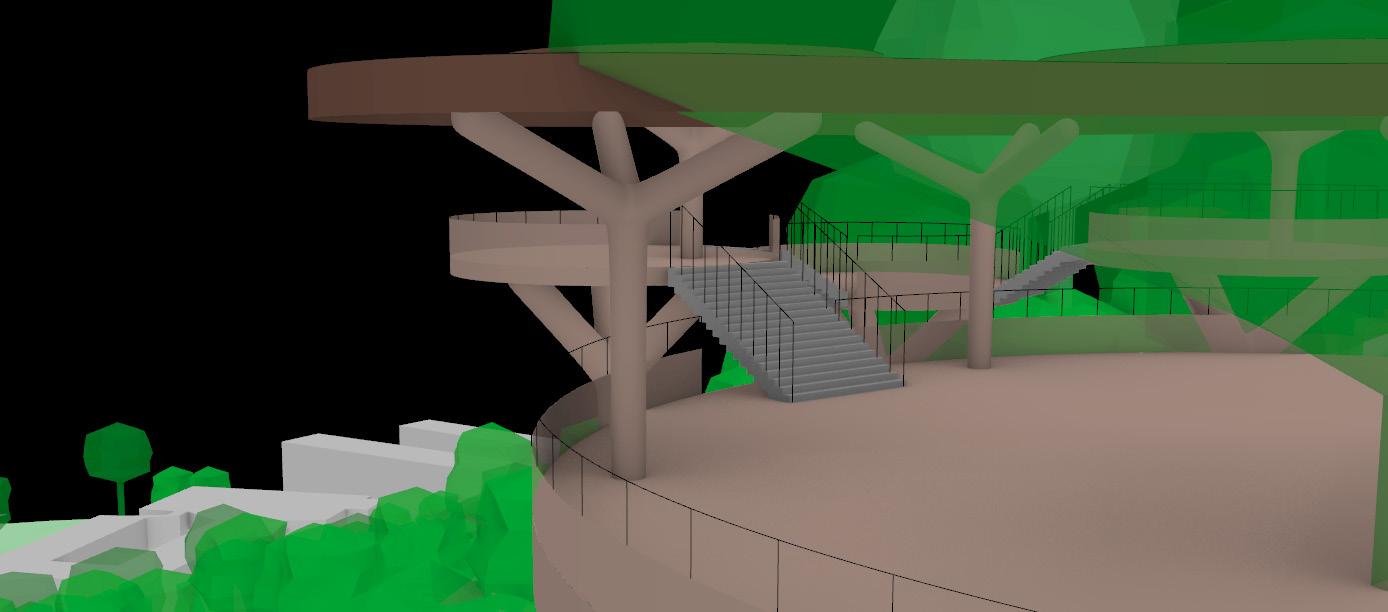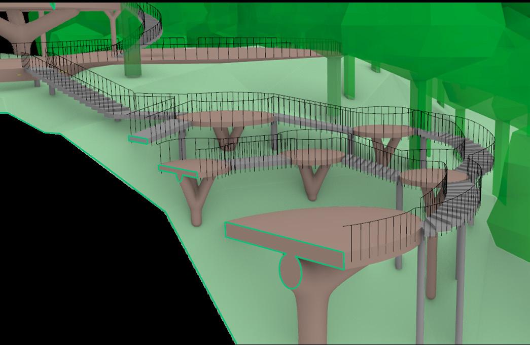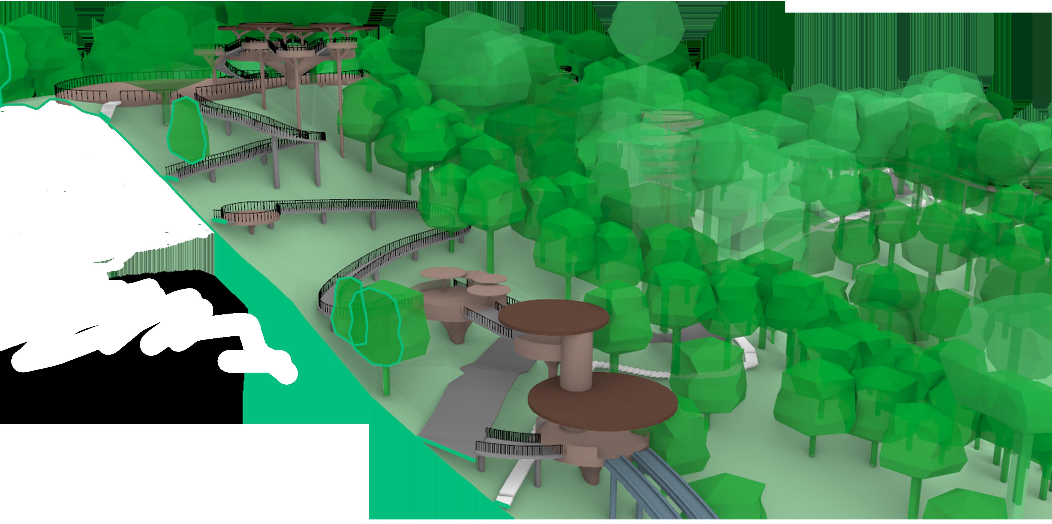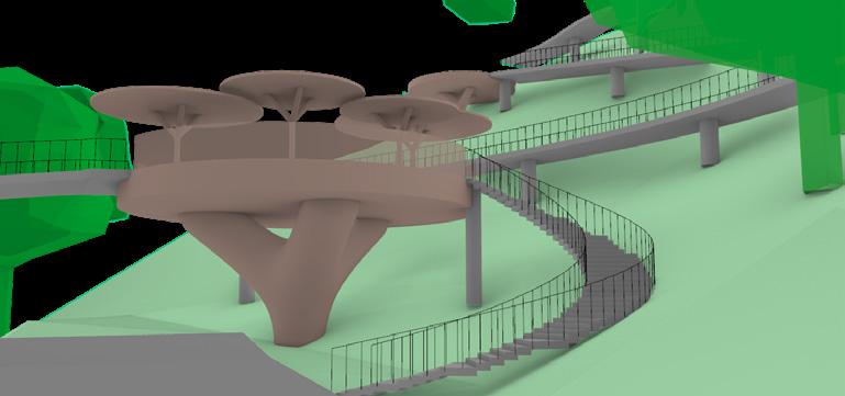 The elevated walk way hugs the topography, minimising height of columns. The stations, pavilions and structure adopt a tree-like design which create a new identity of the area.