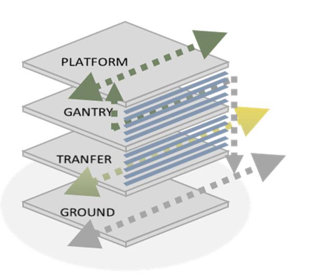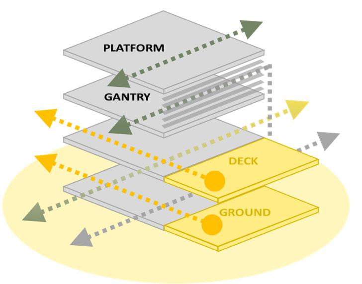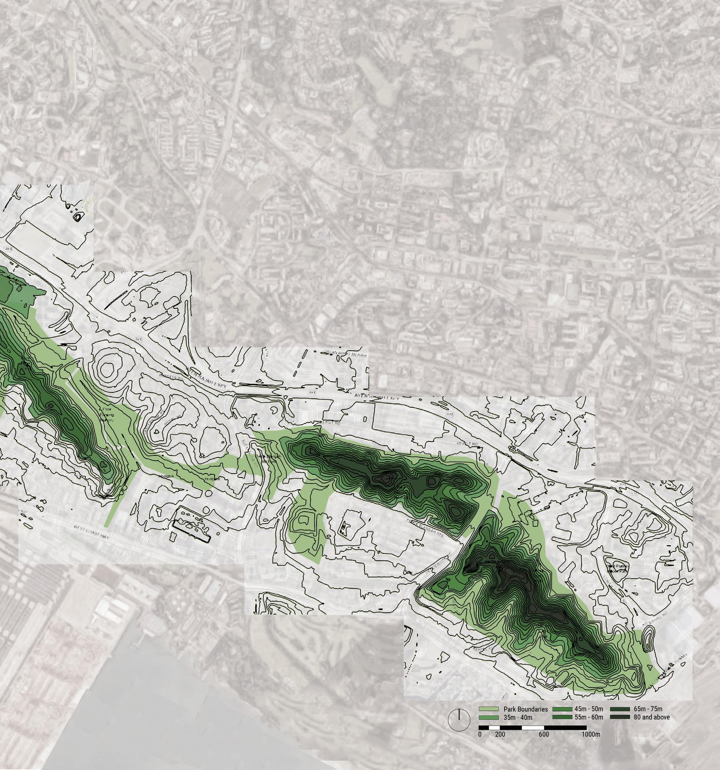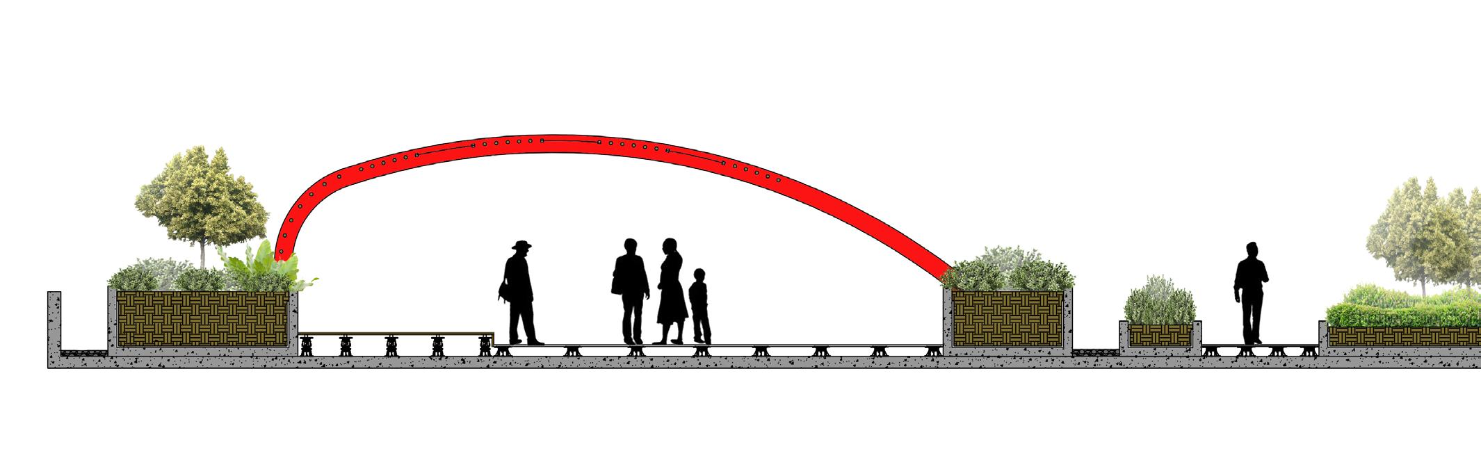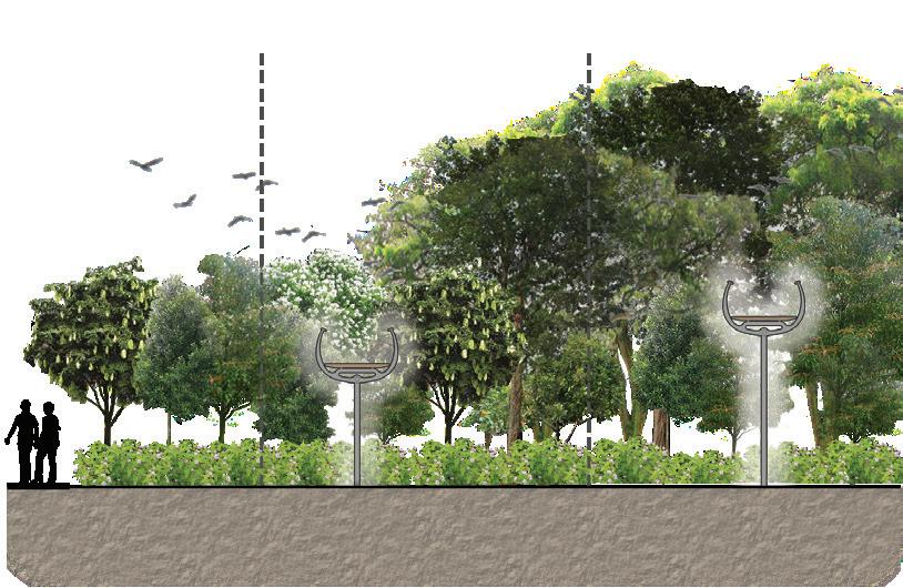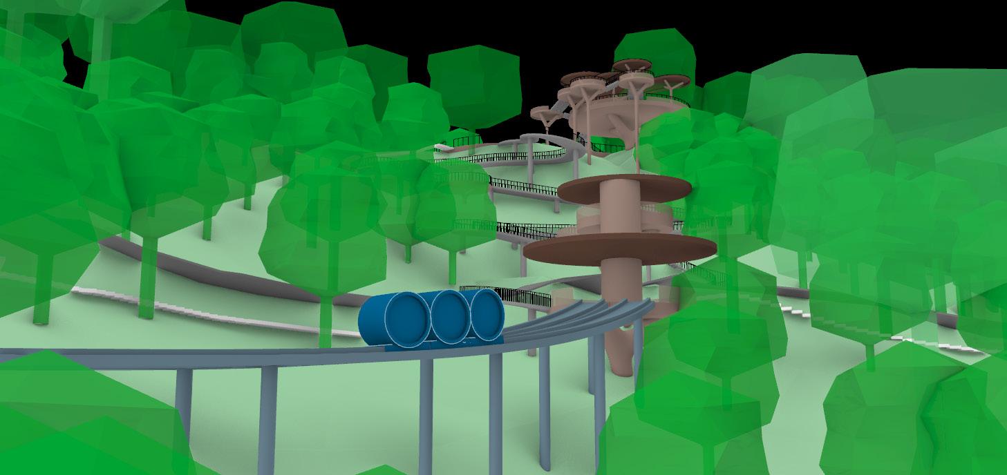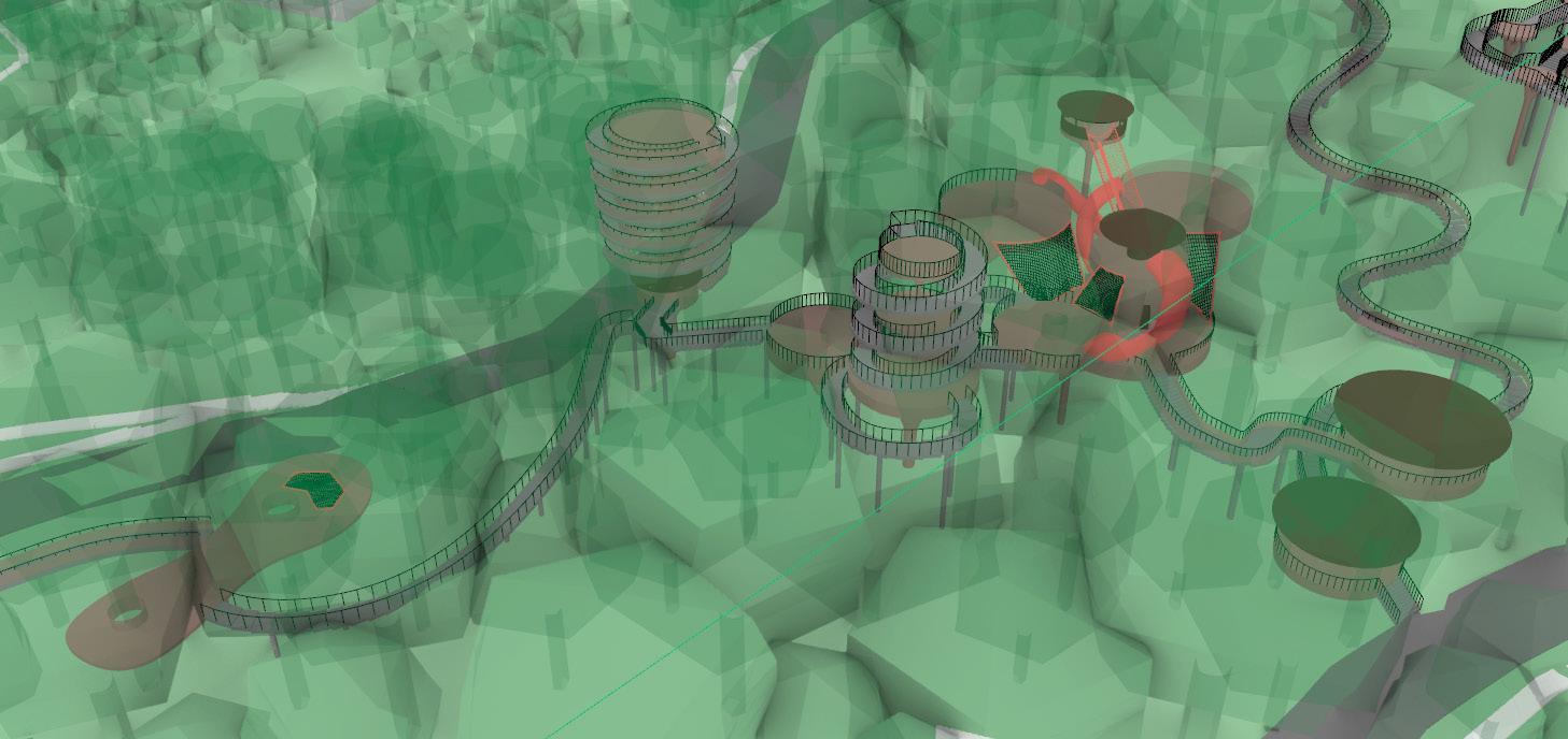 The elevated walk way hugs the topography, minimising height of columns. The stations, pavilions and structure adopt a tree-like design which create a new identity of the area.