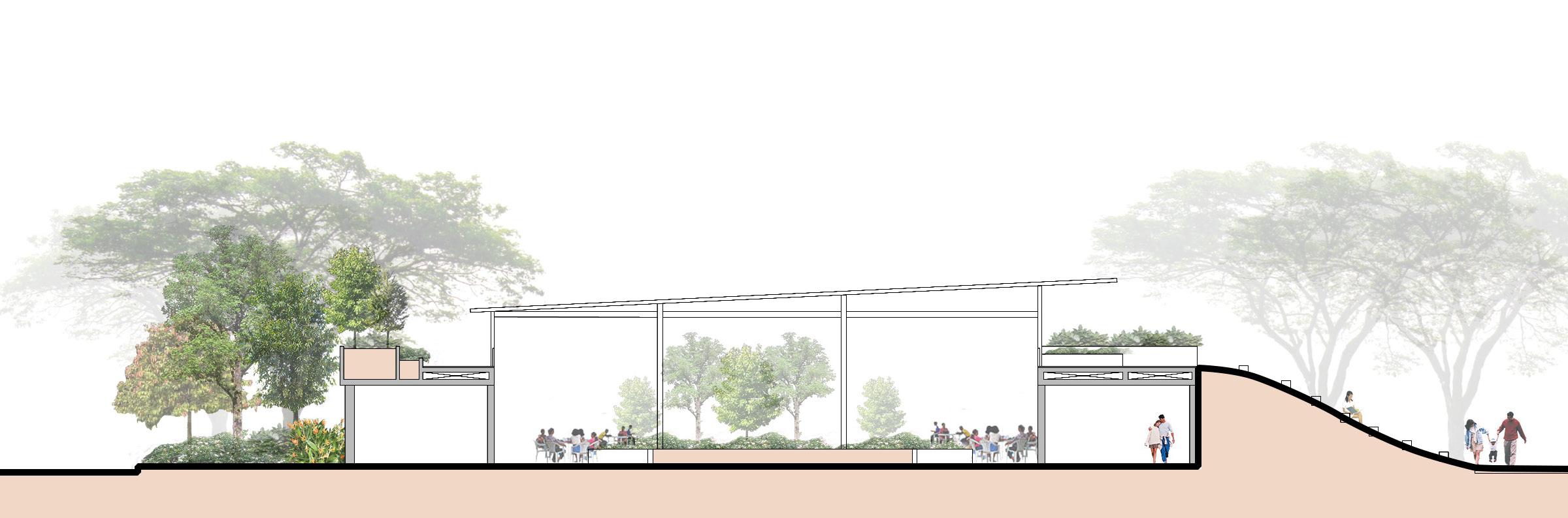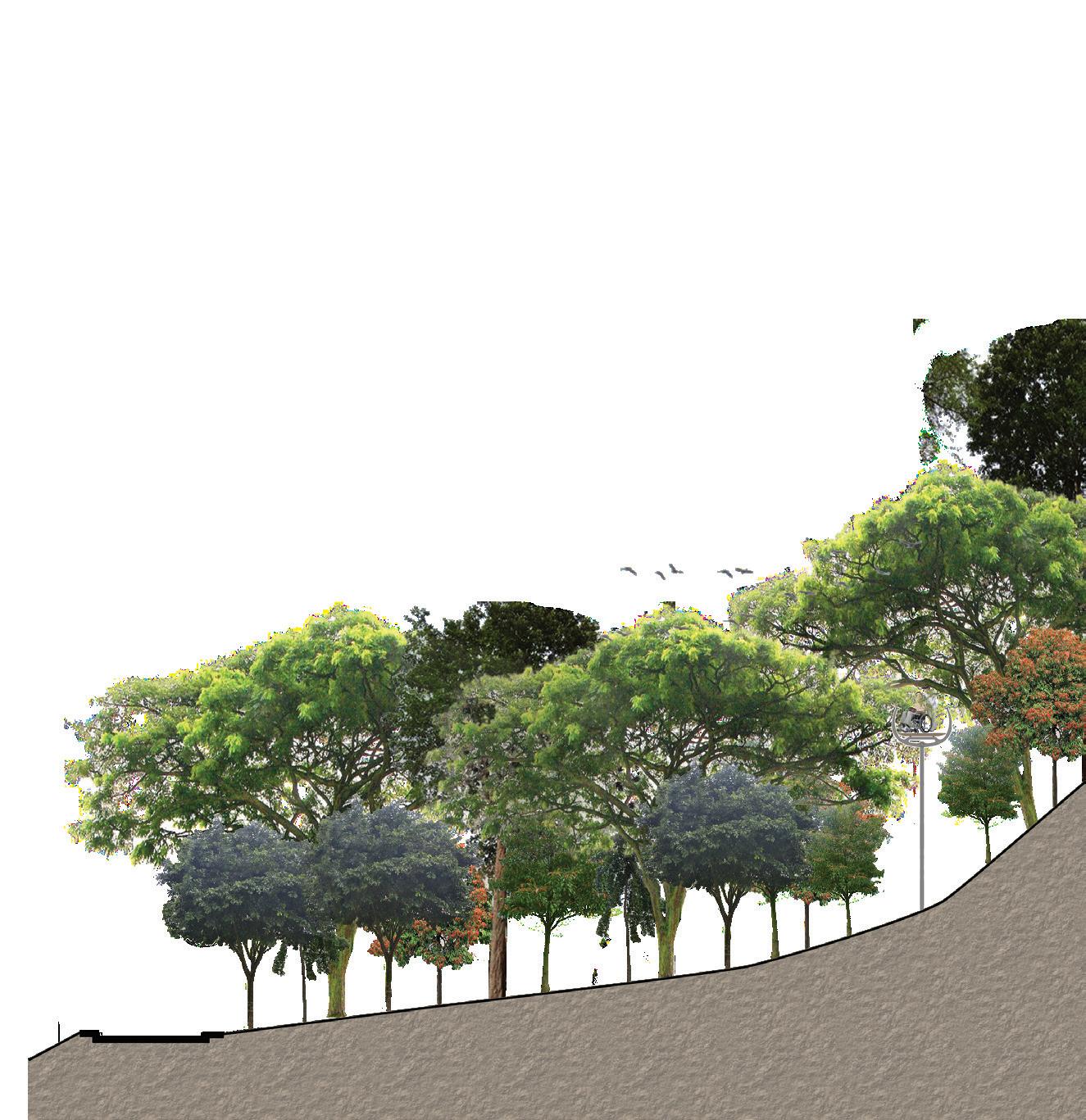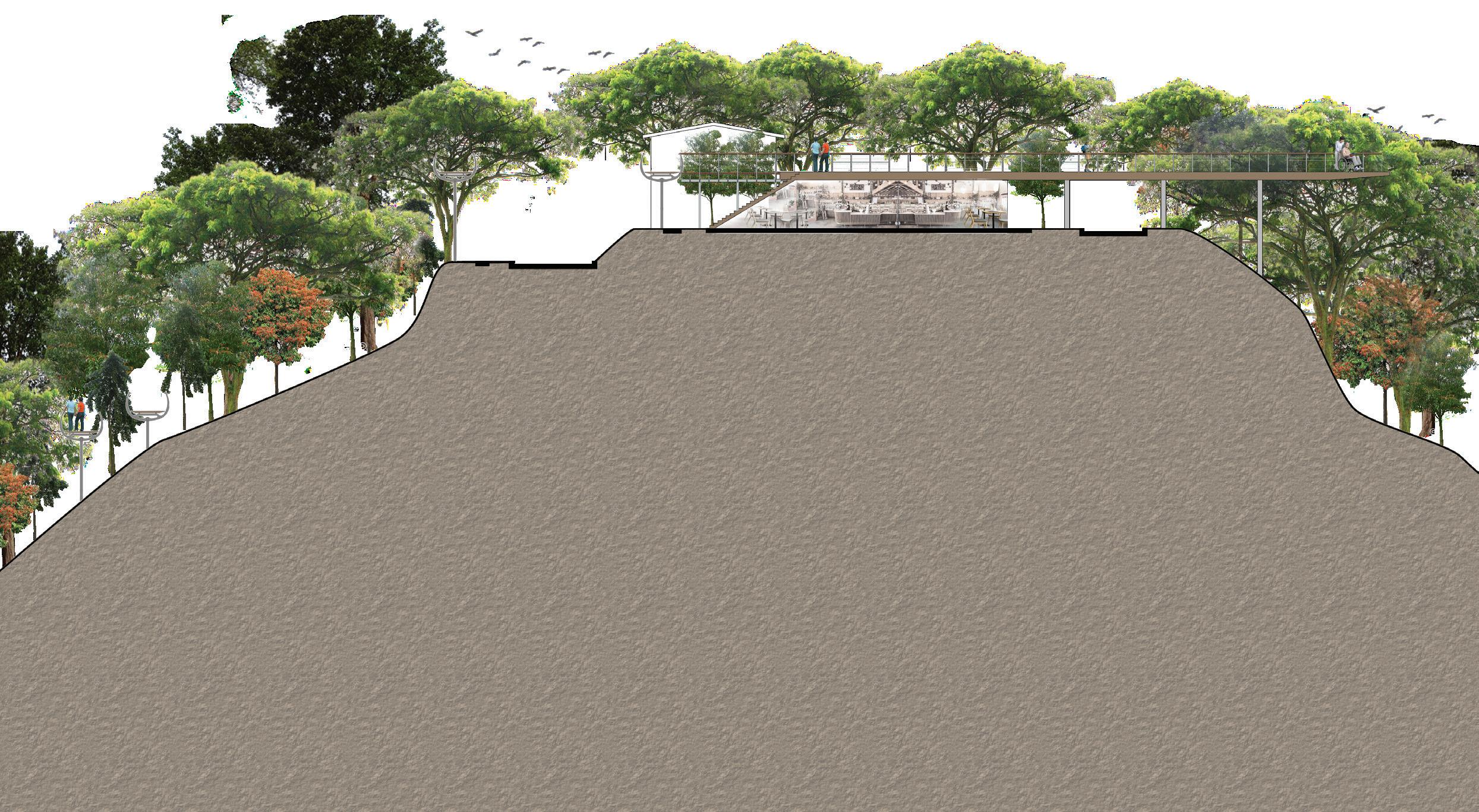 The raised cafe takes advantege of the tree clearing and elevation. It offers customers a panoramic view of the CBD area (East) The platform theatre on the other hand faces the west, which promises a sunset view in the late evenings. It is nestled onto the exsiting topography and within the tree foilage. With a hidden acces point, it serves as both a place for repite as well as an amazing performance area.