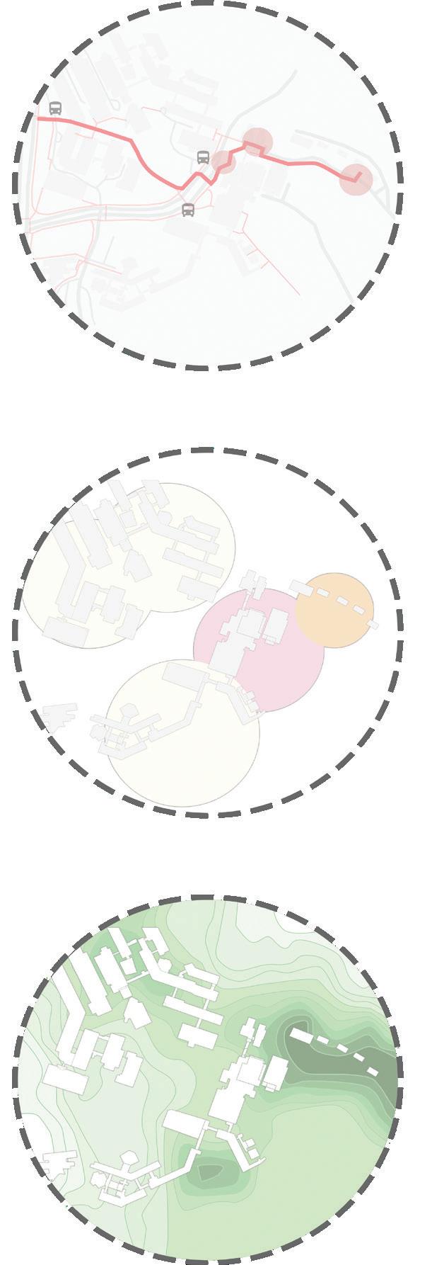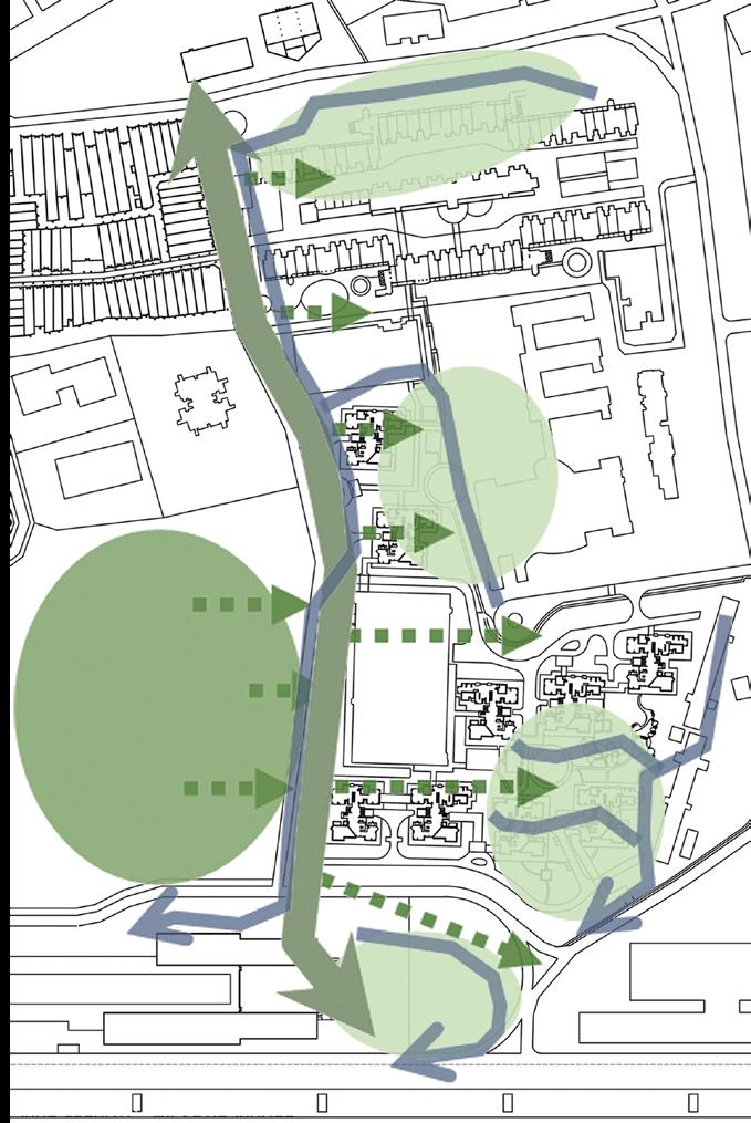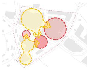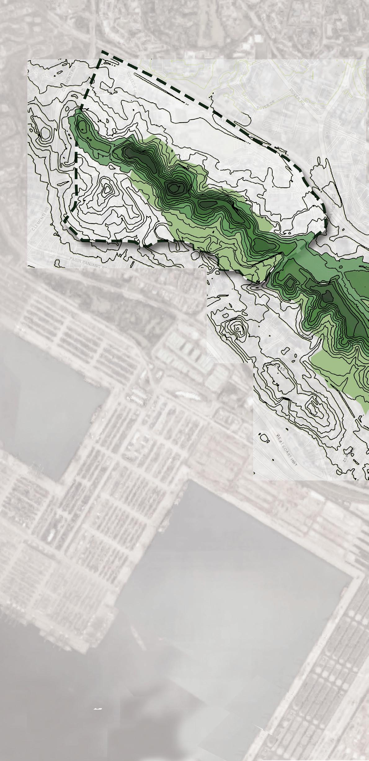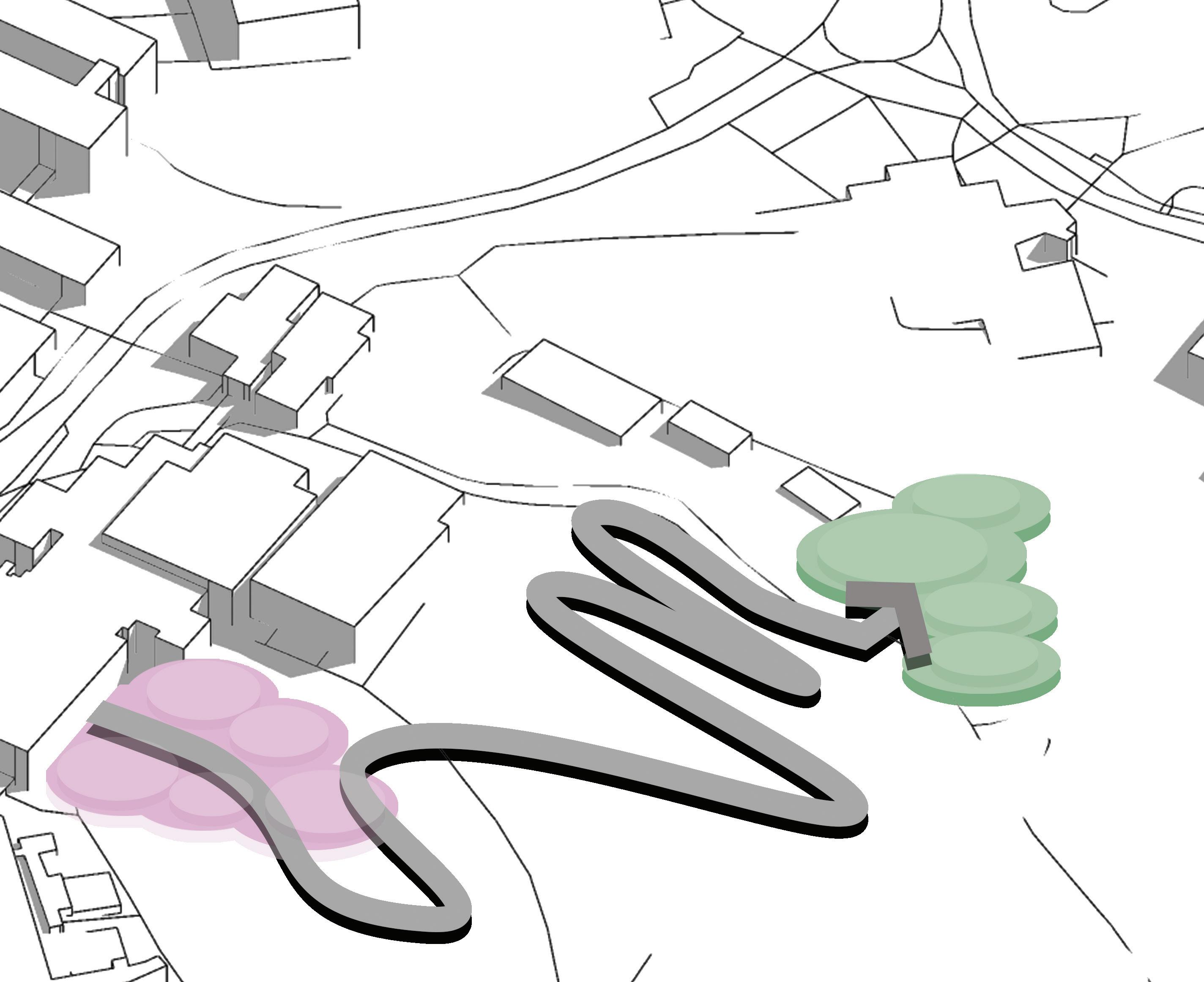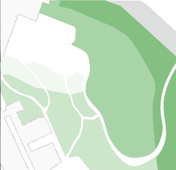 With the workable site, a gradient analysis was carried out to pinpoint areas suitable for intervention. Areas highlighted in green are most suitable for larger spaces.