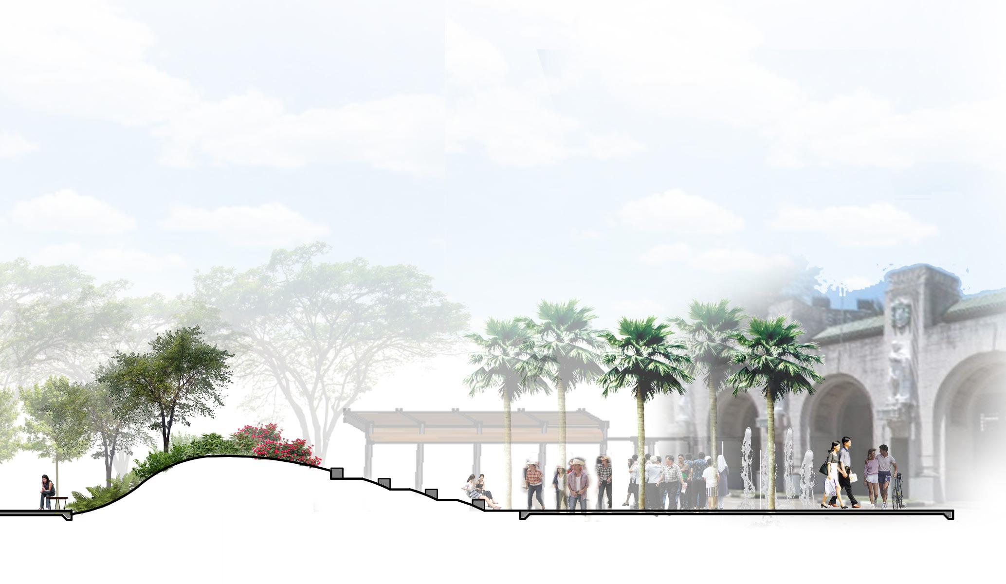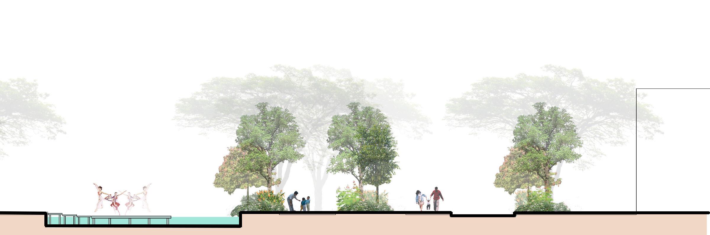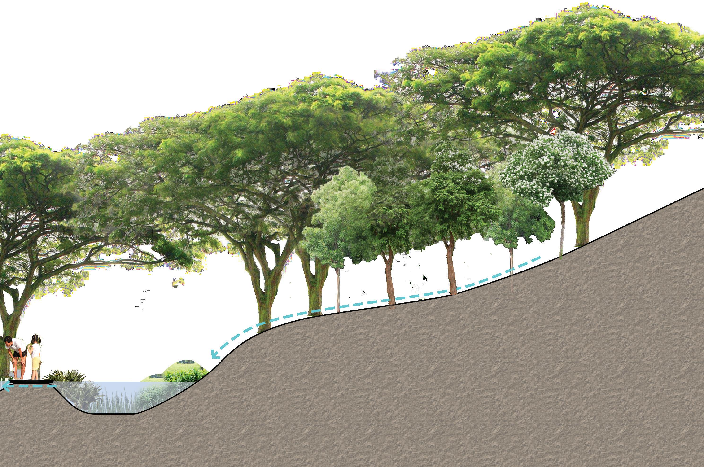 Through usage of the “cut and fill” method, the earth excavated for the Biopond will be used to create undulating terrain, hence demarketing different spaces. The Section below shows how the berm is used as seating and to segregate the active area, Event Space from the passive area, Biopond