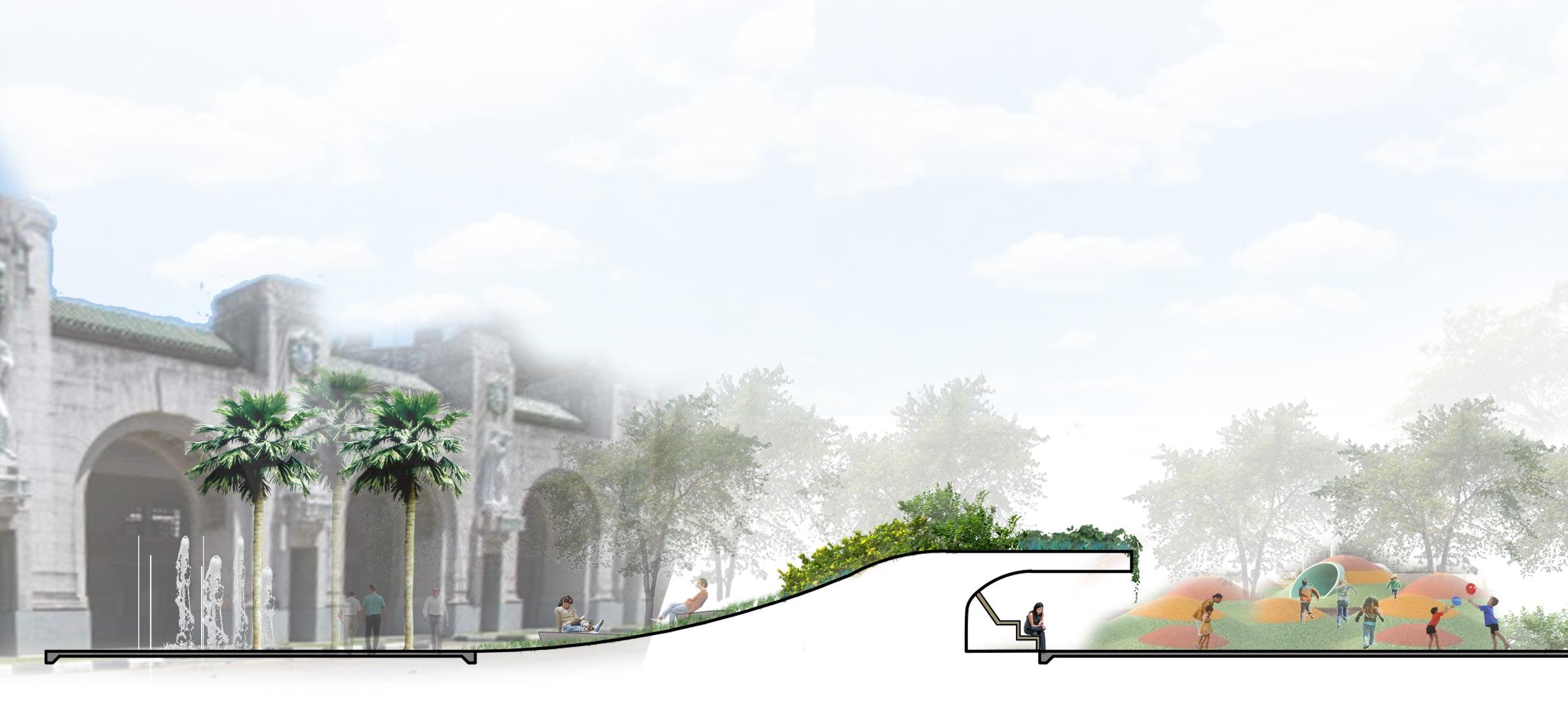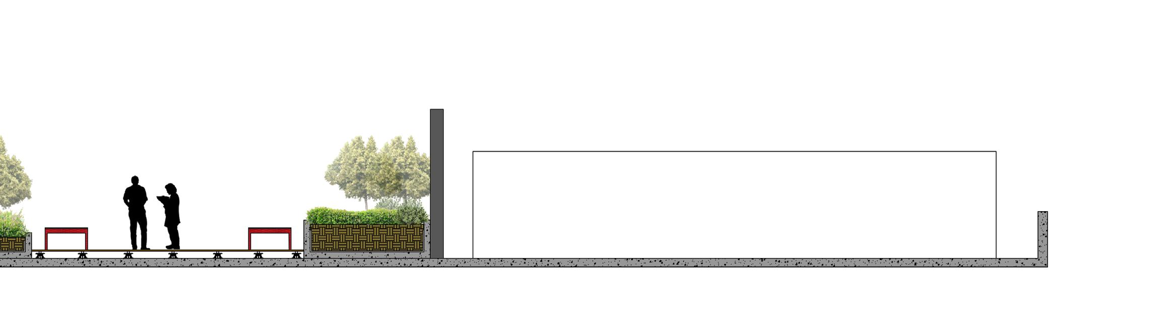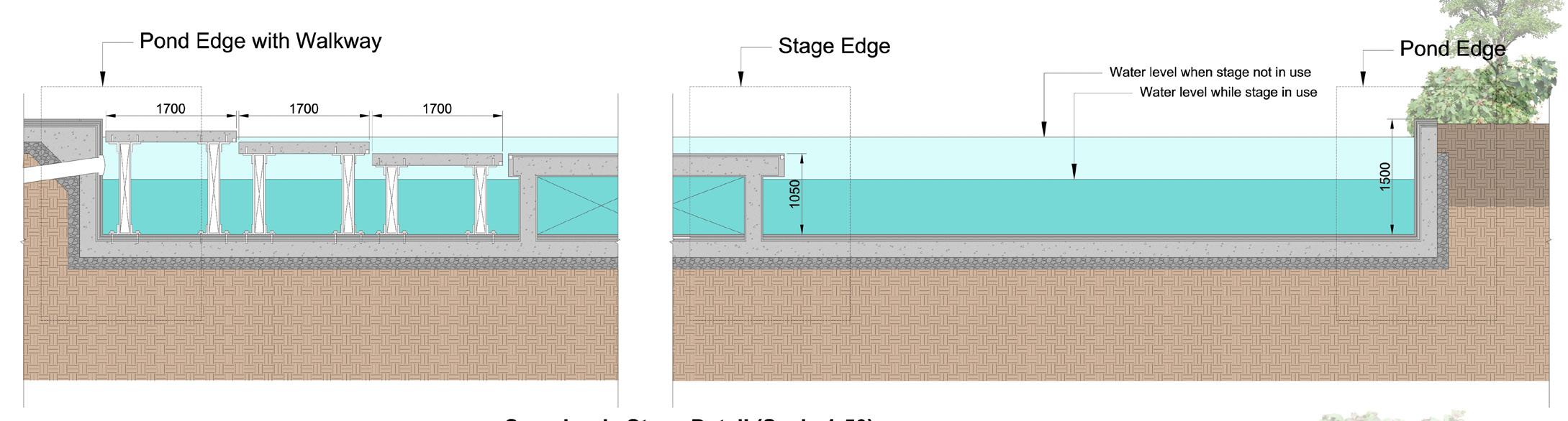 Through usage of the “cut and fill” method, the earth excavated for the Biopond will be used to create undulating terrain, hence demarketing different spaces. The Section below shows how the berm is used as seating and to segregate the active area, Event Space from the passive area, Biopond