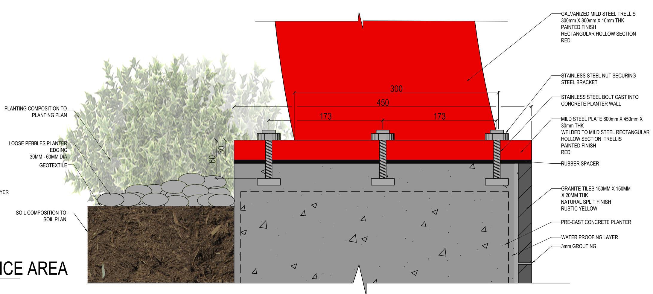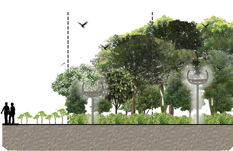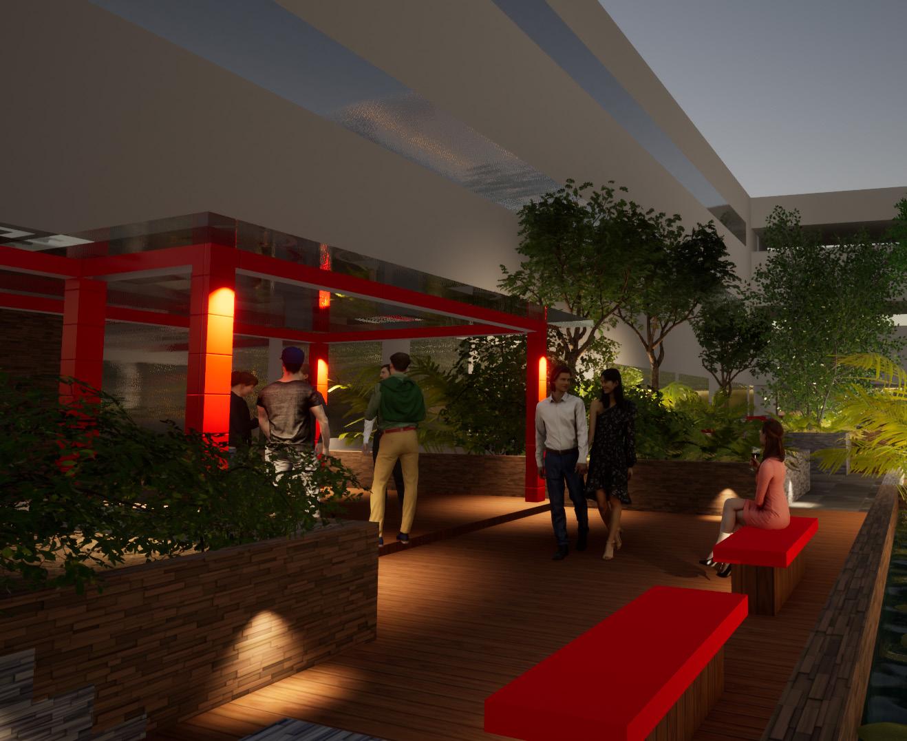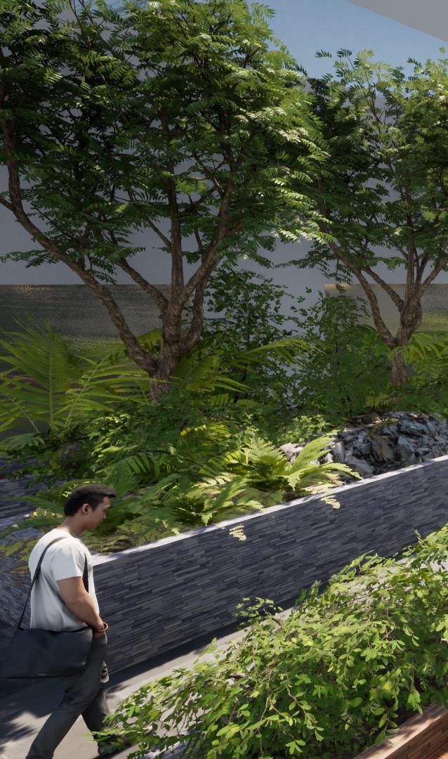 The proposed design would divide the atrium into smaller semi-open spaces which could be used for social gatherings and small informal meetings. The planting scheme would by enhanced to encourage biodiversity. The trees are placed in a manner that does not disrupt the wind tunnel but still be able to cast ample shade during warmer afternoons.