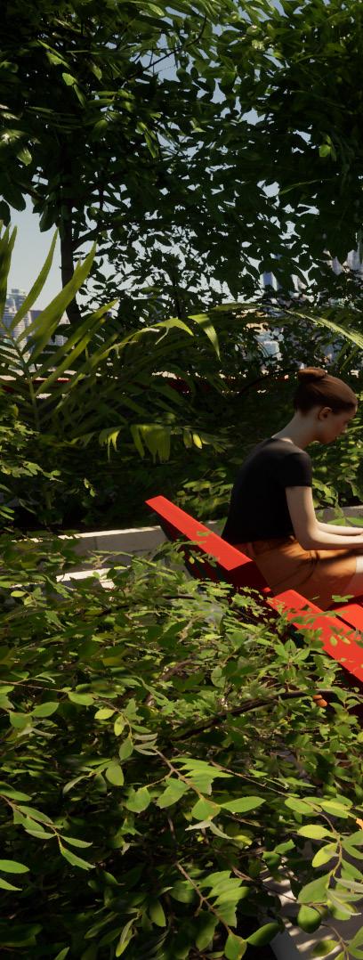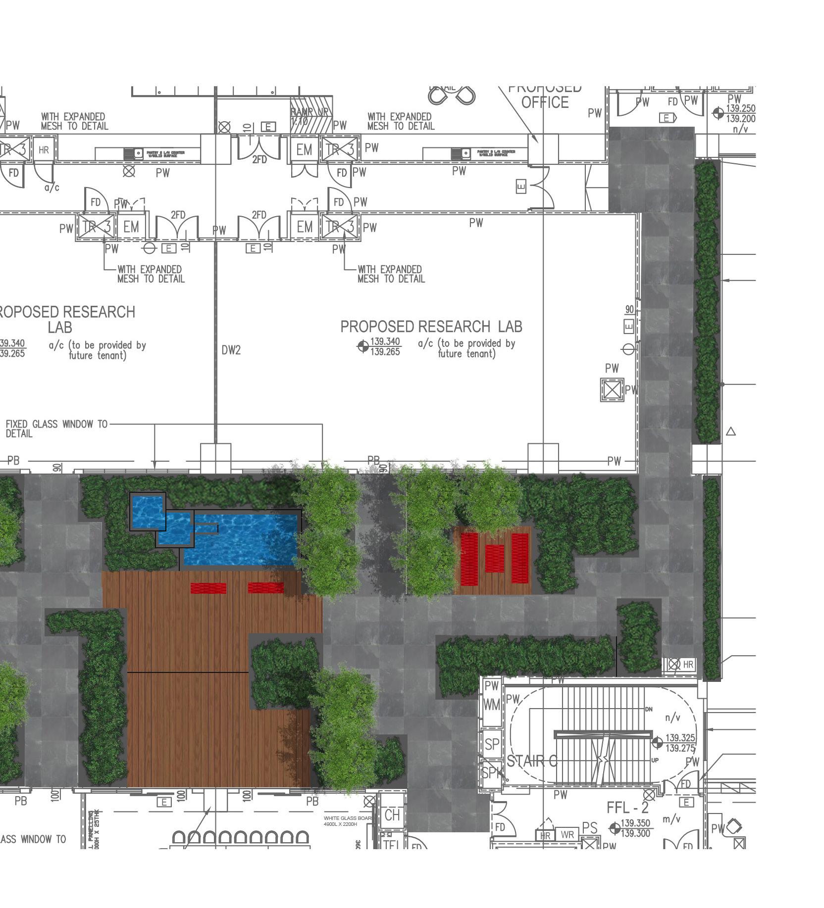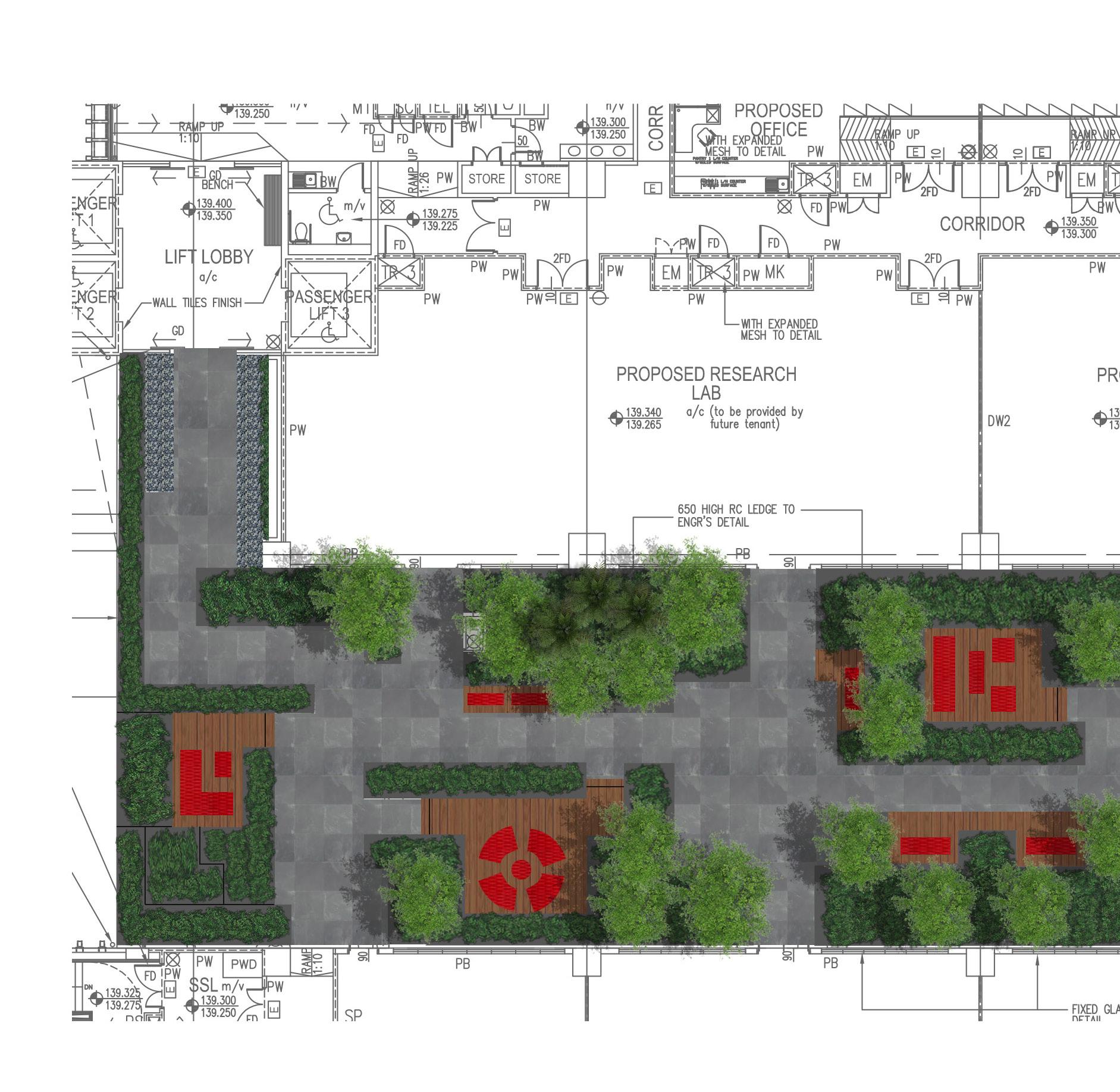 The building consists of 6 floors and a rooftop, inaccessible to tenants. The project brief required us to redesign the Level 4 atrium and the Rooftop level. Most of the landscape spaces were underutilised, unwelcoming and in need of a revamp. With sustainability and human-nature engagement as the driving factor, the proposal intends to foster