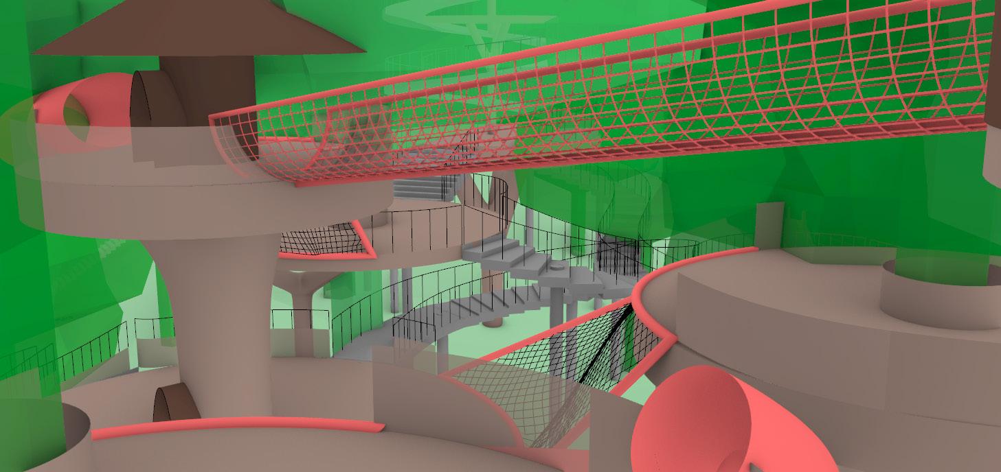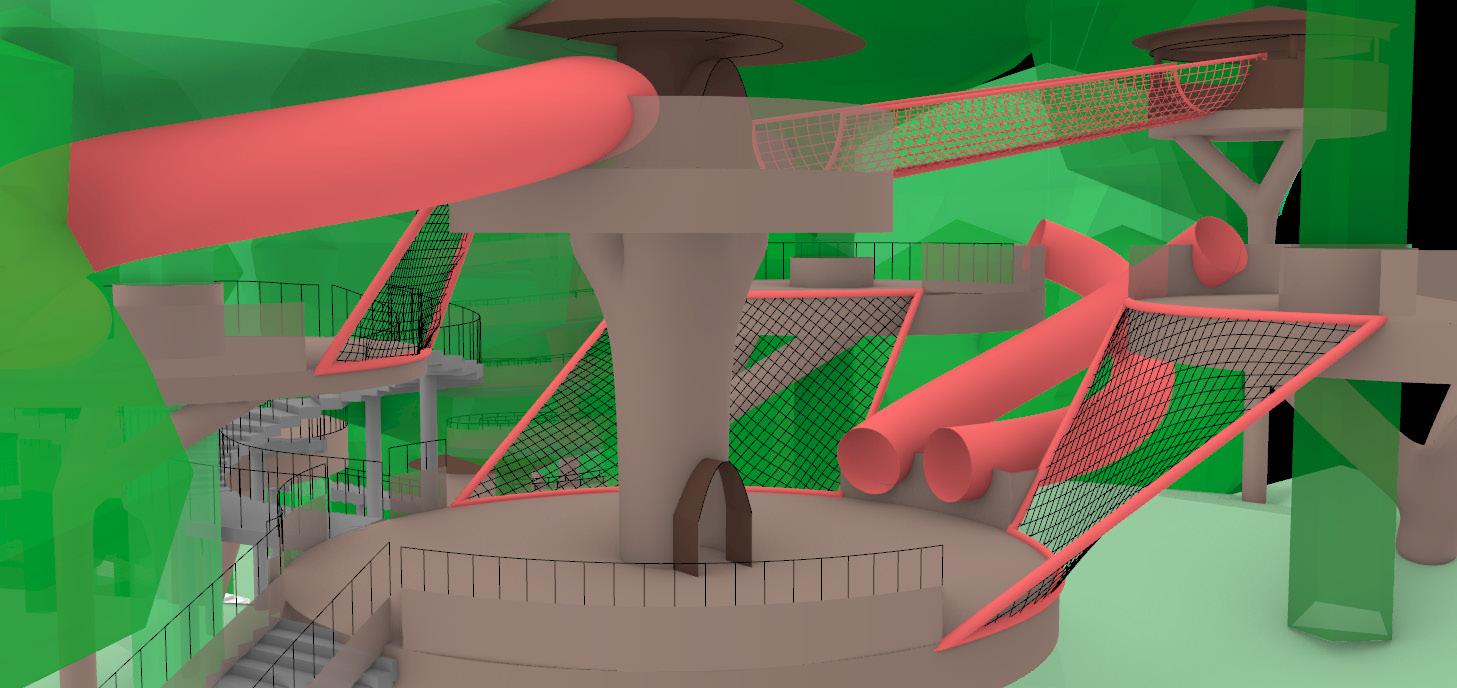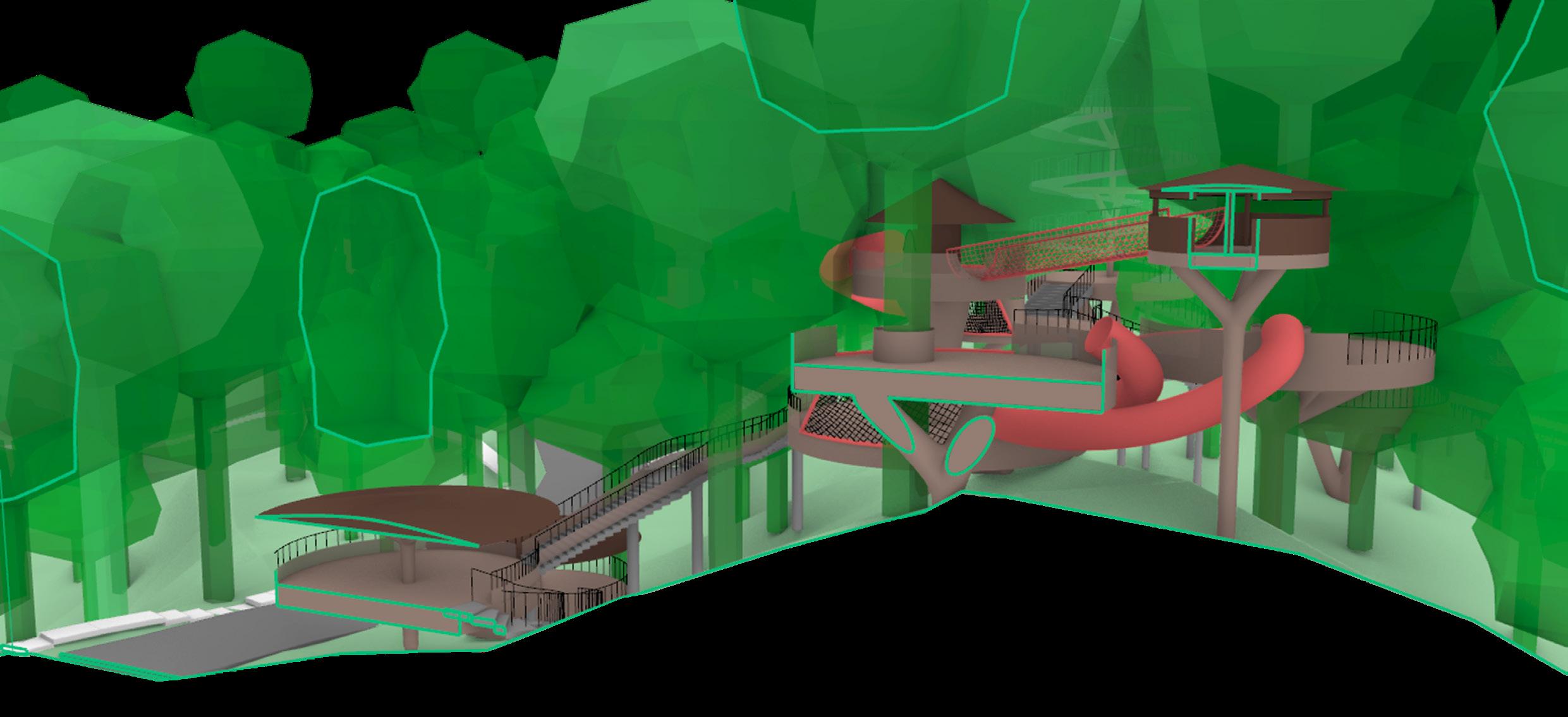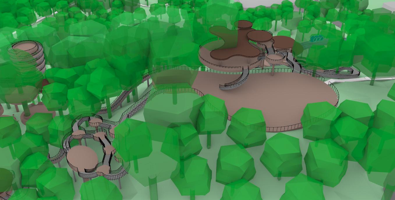 The structures are fitted amongst the tree canopy and raised at different elevations providing varying experiences. They are also integrated with existing trees and takes advantage of the different forest levels. Various play elements allow users to experience different ways of traversing within the canopies. The platforms also allow the addition of propriety play elements.