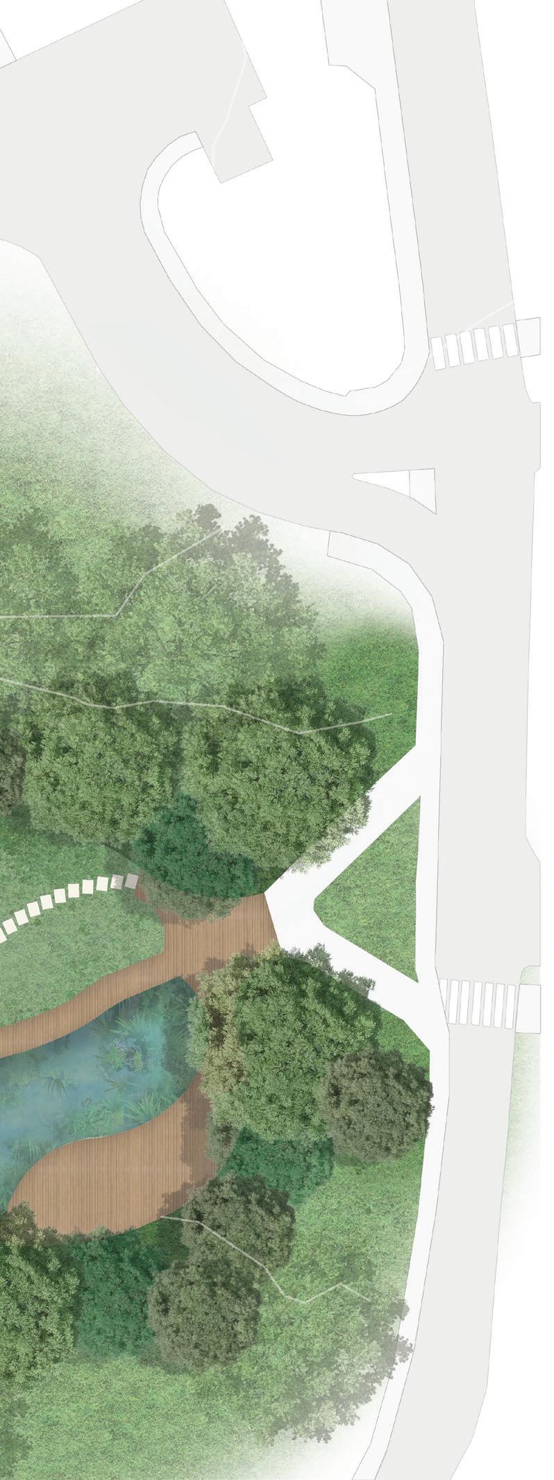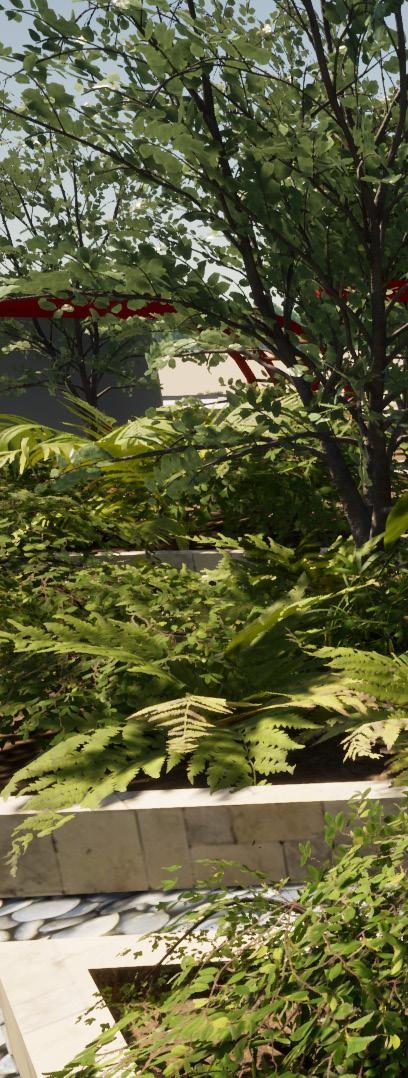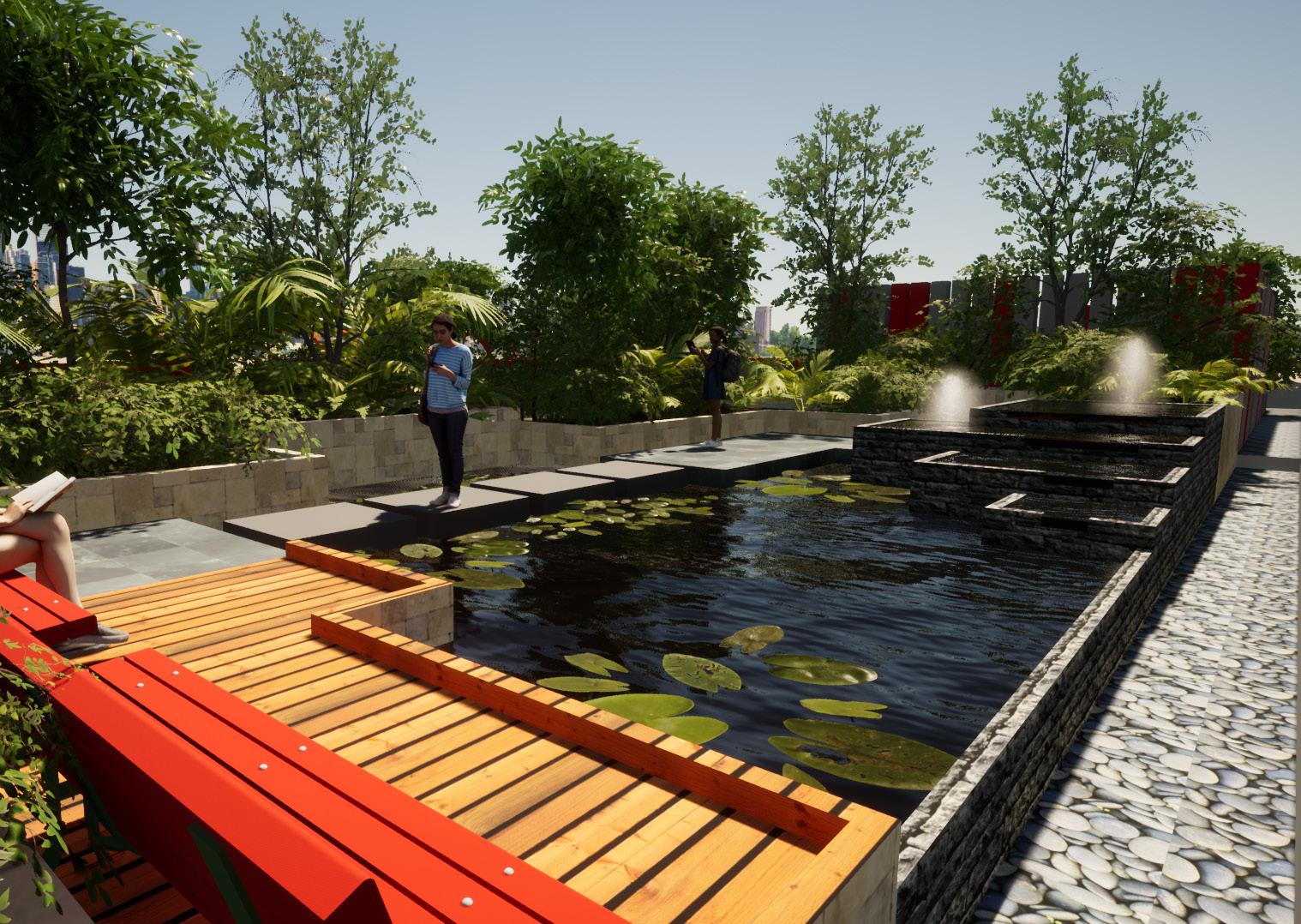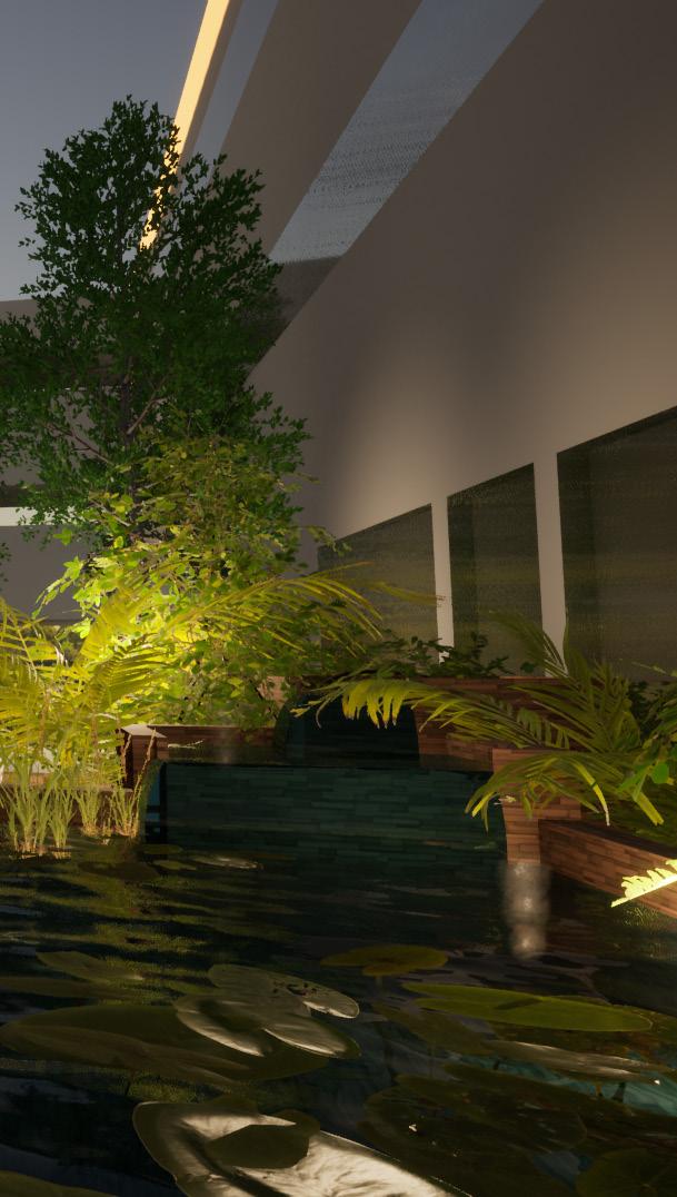 The roof is delineated into passive and active zones. The passive section features an alcove seating area with panoramic views of CleanTech2’s surroundings and a naturalized pond. The low-maintenance naturalized pond leverages self-cleaning processes, utilizing aquatic plants on the periphery to generate oxygen and provide shelter for fish. The nitrogenrich excretions from the fish serve as essential nutrients for the plants. To prevent algae growth, a cascading fountain creates water movement while producing ambient sounds for users. Any existing algae is naturally managed as it becomes a food source for the fish.