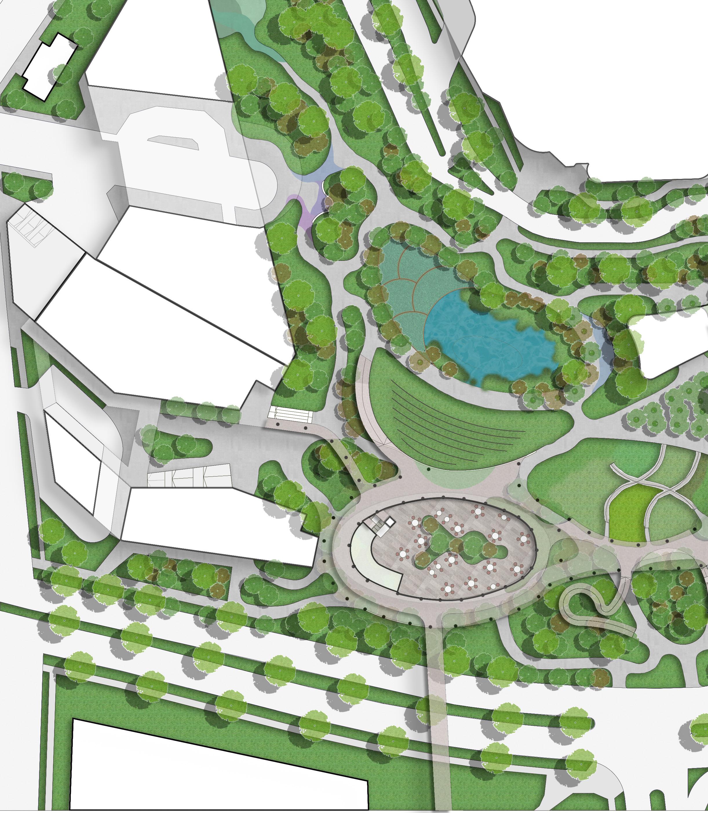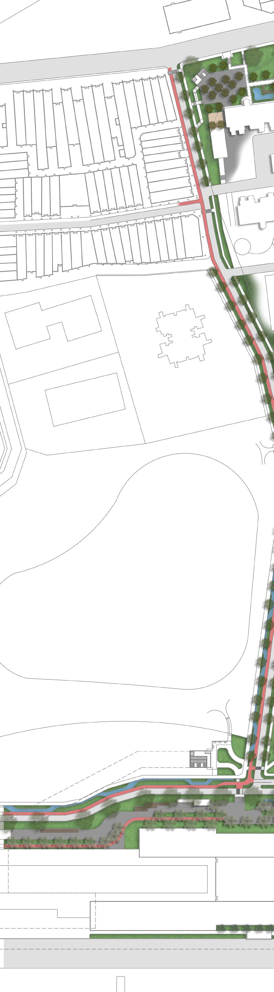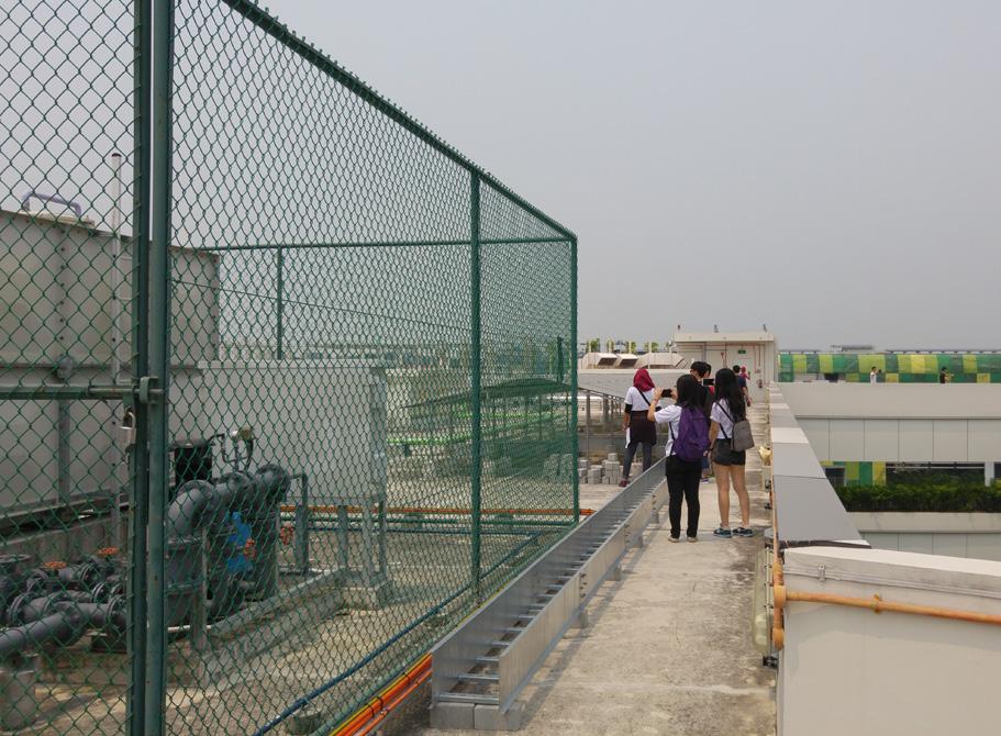 The roof is delineated into passive and active zones. The passive section features an alcove seating area with panoramic views of CleanTech2’s surroundings and a naturalized pond. The low-maintenance naturalized pond leverages self-cleaning processes, utilizing aquatic plants on the periphery to generate oxygen and provide shelter for fish. The nitrogenrich excretions from the fish serve as essential nutrients for the plants. To prevent algae growth, a cascading fountain creates water movement while producing ambient sounds for users. Any existing algae is naturally managed as it becomes a food source for the fish.
