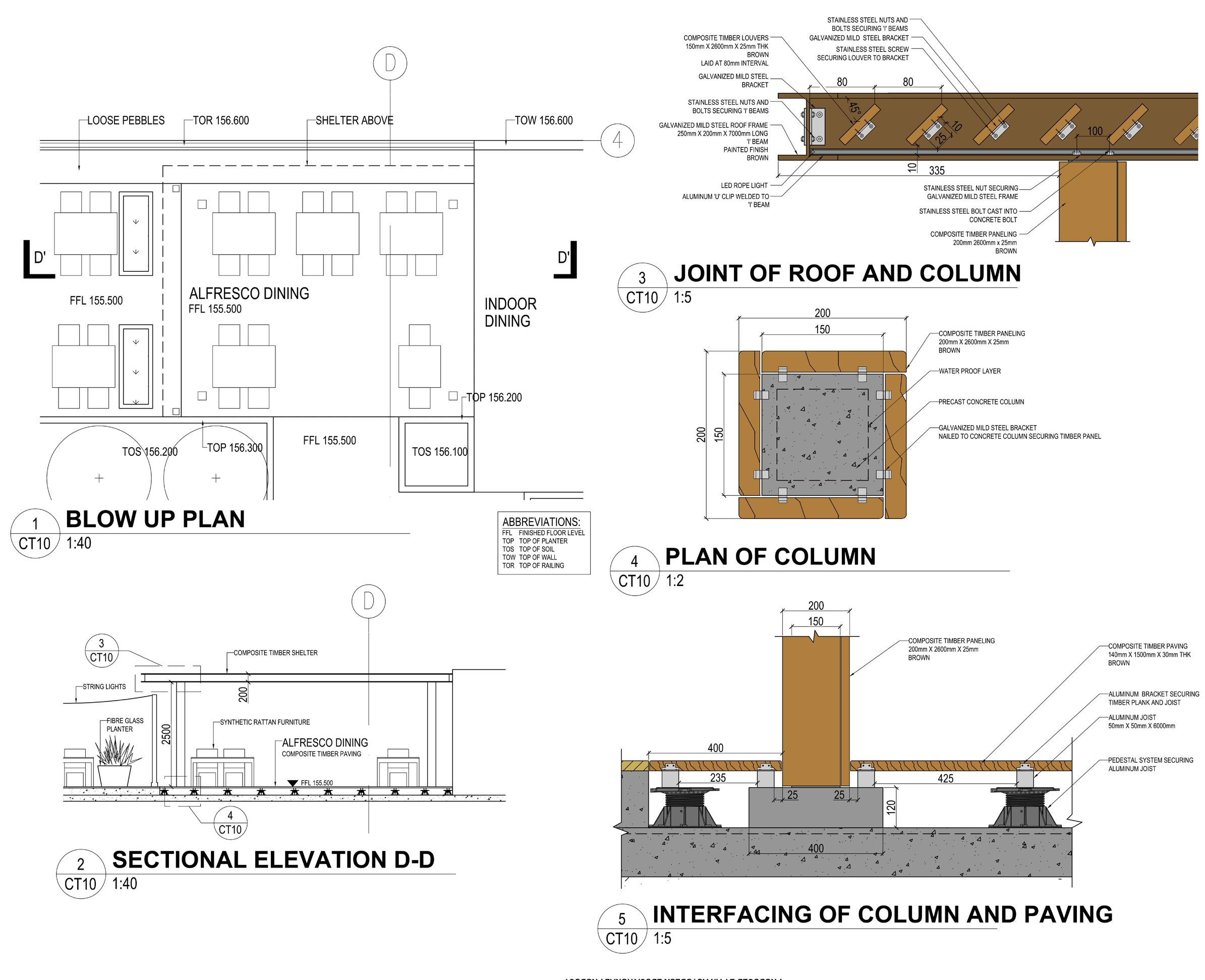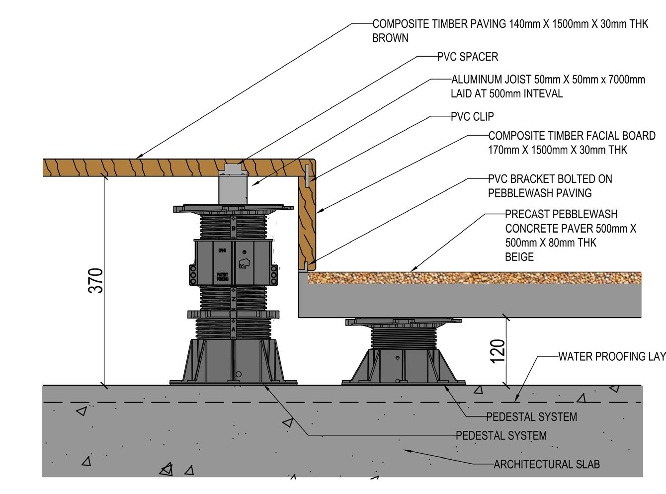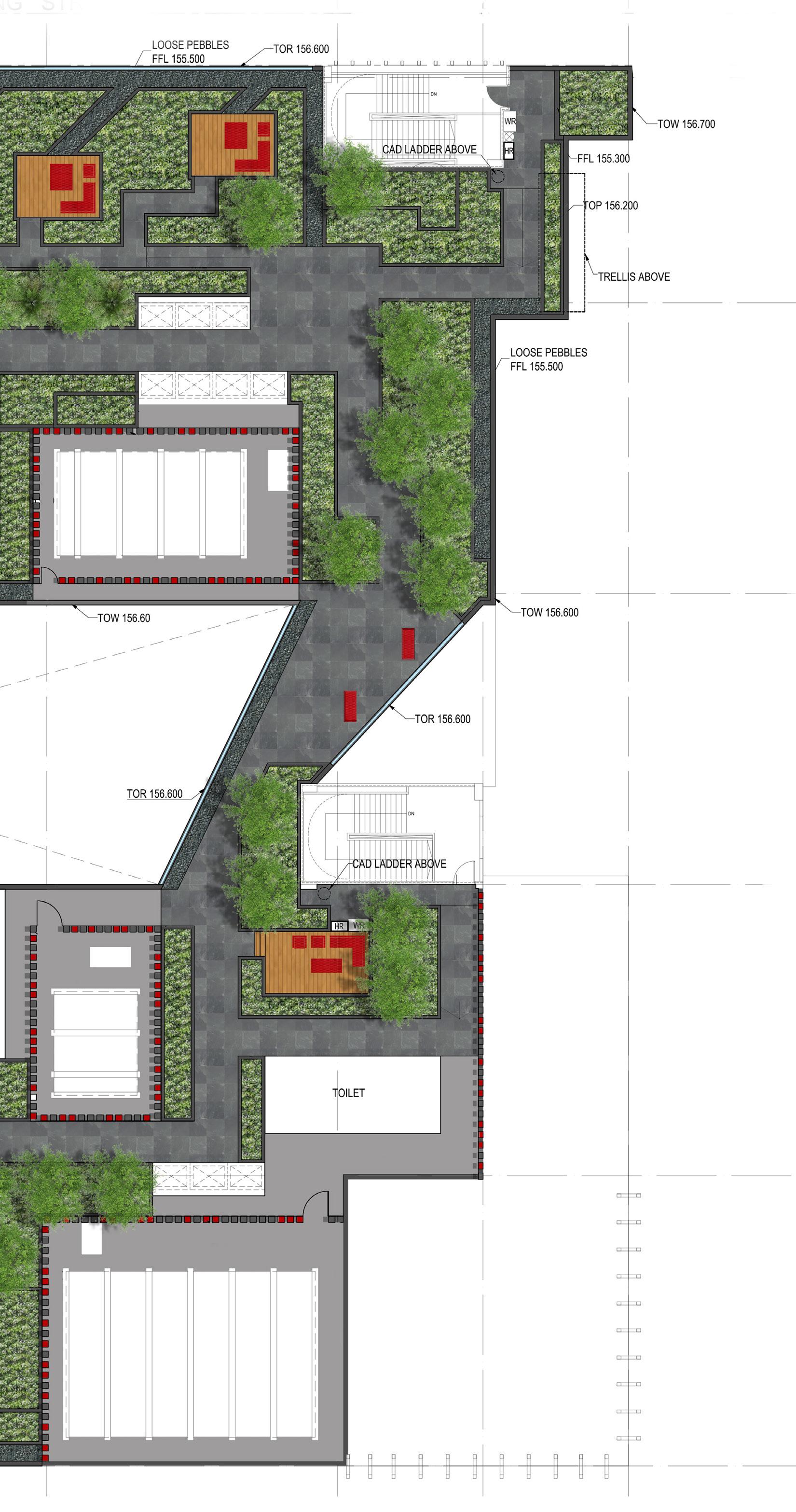 To safeguard the roof’s waterproofing layer from potential damage, the finish floor level is elevated by 200mm using a pedestal system. This approach eliminates the need to alter the actual roof slab. The existing spoon drain is preserved and seamlessly integrated into the proposed drainage design. The loose pebbles surrounding the roof not only serve as maintenance access but are also incorporated as a deliberate part of the overall design.