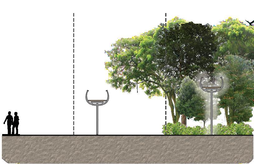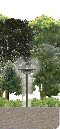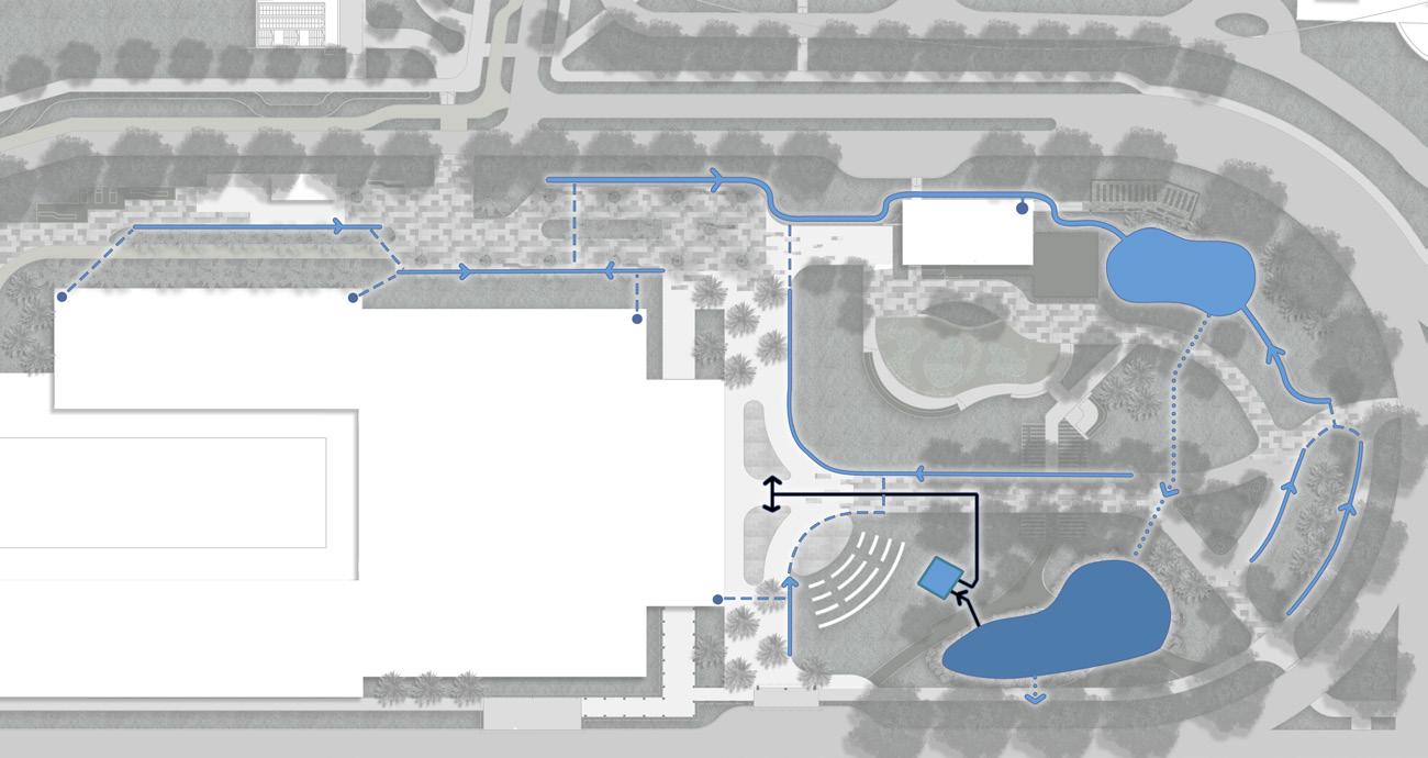 A water harvesting system would be introduced, to decrease the reliance of water from external sources. Water runoff from roof structures will be channelled by bioswales into the raingarden. Water will then be collected by the water harvesting tank situated under the raingarden. Water will be pumped to the water points to be used for irrigation and used to top up the biopond when needed. The water would also be treated to be used for the water fountains in the event space.