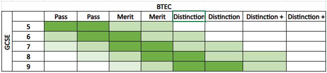 We understand that the transi�on between GCSE and A level and BTEC can be confusin and uncertain. The table below shows the general rela�onship between grades a�ained at GCSE and poten�al outcomes at A level and BTEC.
