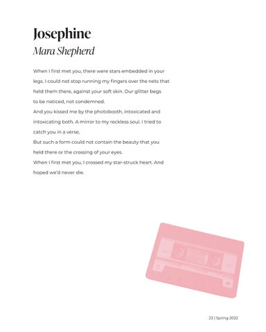 Josephine Mara Shepherd When I first met you, there were stars embedded in your legs. I could not stop running my fingers over the nets that held them there, against your soft skin. Our glitter begs to be noticed, not condemned. And you kissed me by the photobooth, intoxicated and intoxicating both. A mirror to my reckless soul. I tried to catch you in a verse, But such a form could not contain the beauty that you held there or the crossing of your eyes. When I first met you, I crossed my star-struck heart. And hoped we’d never die.