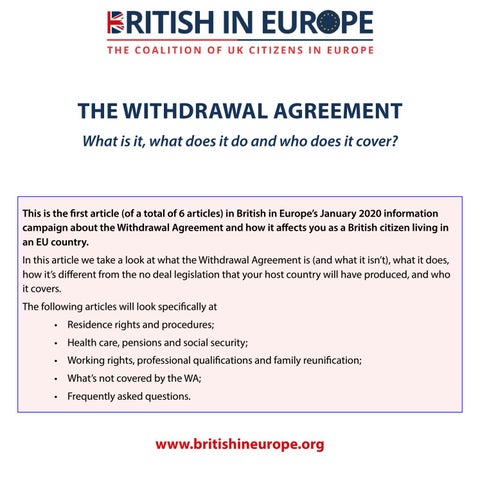 This is the first article (of a total of 6 articles) in British in Europe’s January 2020 information campaign about the Withdrawal Agreement and how it affects you as a British citizen living in an EU country. In this article we take a look at what the Withdrawal Agreement is (and what it isn’t), what it does, how it’s different from the no deal legislation that your host country will have produced, and who it covers. The following articles will look specifically at • Residence rights and procedures; • Health care, pensions and social security; • Working rights, professional qualifications and family reunification; • What’s not covered by the WA; • Frequently asked questions.