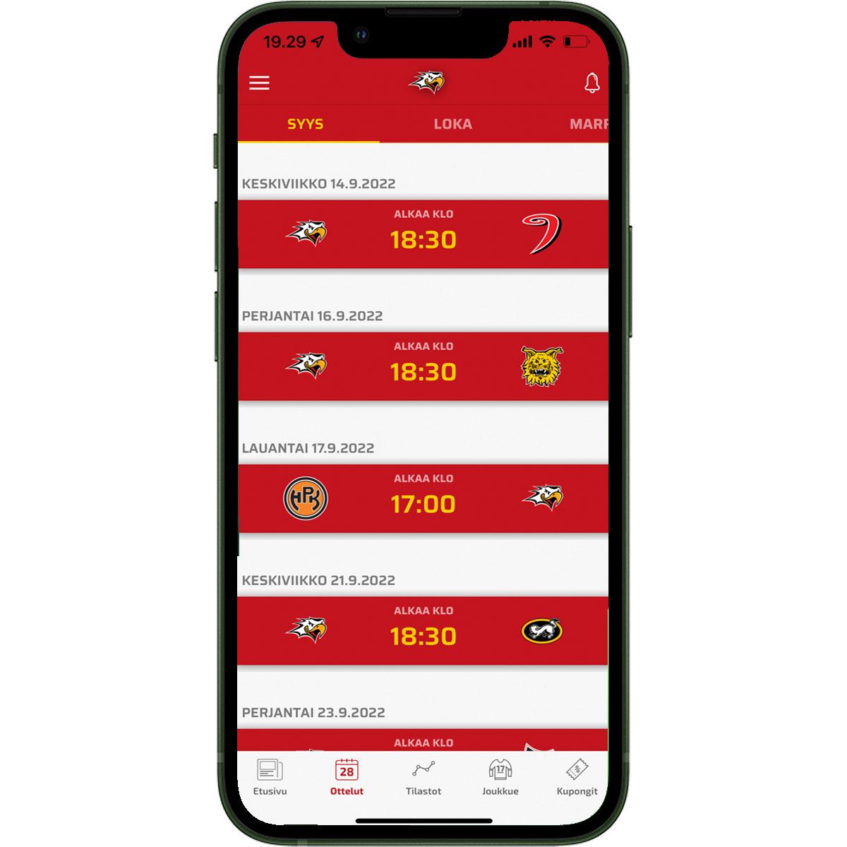 LATAA SPORTIN MOBIILISOVELLUS! KAIKKI UUTISET YHDESTÄ PAIKASTA! - ENNAKOT, KOKOONPANOT JA RAPORTIT - LIVESEURANTA VIDEOILLA - PELAAJASTATISTIIKAT - KAUSIKORTTI KÄTEVÄSTI SÄHKÖISENÄ PUHELIMESSA: LAINAA KORTTIA NÄPPÄRÄSTI SOVELLUKSEN KAUTTA ELLET ITSE PÄÄSE PELIIN TULOSSA! SOVELLUKSEN OMAT ETUKUPONGIT LATAA NYT: 6ROHKEASTI KOHTI MAALIA.