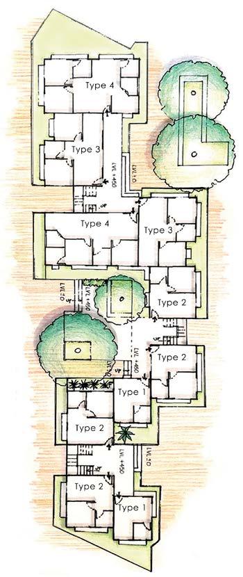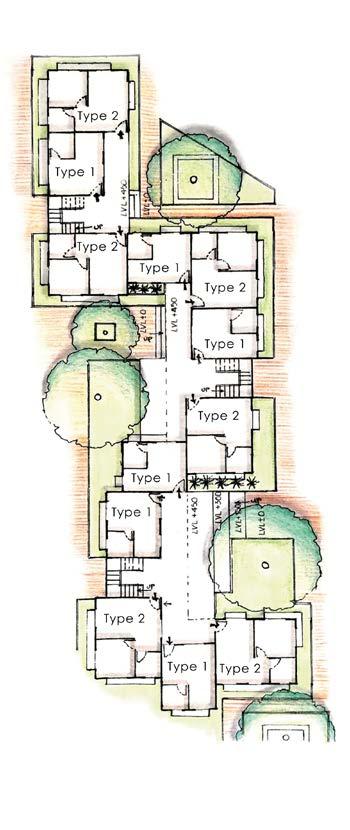 Narrow pedestrian walkways between the clusters recreate the sense of the local streets.