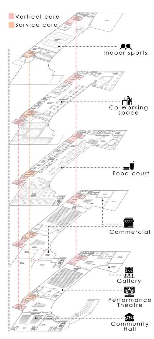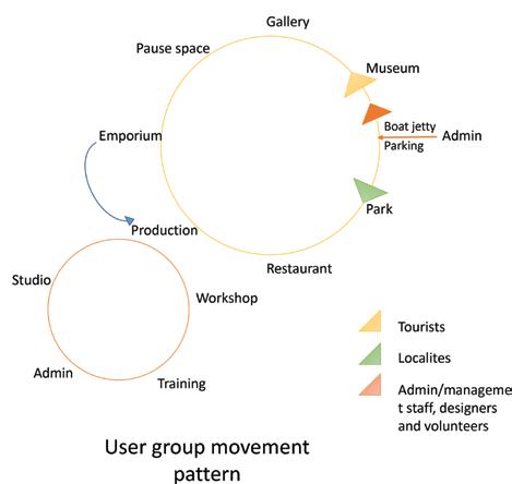 Main users are categorized into 2, visitors and staff. The visitor’s circuit starts from either from parking or the entrance plaza, starting from the museum connecting emporium through gallery acting as a pause space and leading to production units. The circuit ends in the restaurant which is directly connected to the park and landscape. Staff’s parking is provided next to service entry adjacent to production units and their auxiliary spaces. It also connected with the canteen and administrative block.